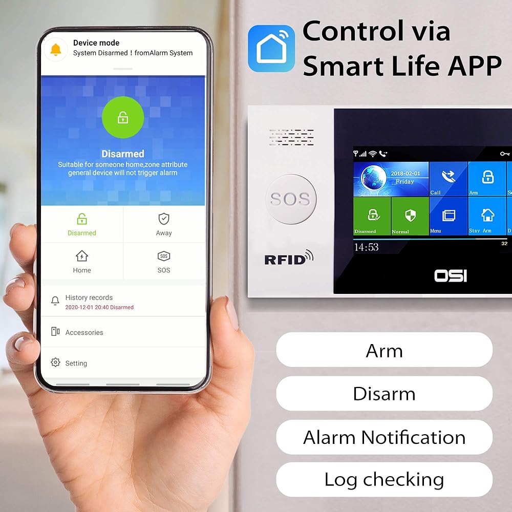 【COMPLETE CONTROL FROM SMART LIFE APP】-- This self-monitoring system allows you to arm and disarm the system, get notifications, set alarm modes, sync all your OSI Alarm devices and monitor them from the Smart Life App! If Wi-Fi isn't available, you will need to use your phone's data plan. When you receive event notifications, you control over making the decision to contact the local authorities.