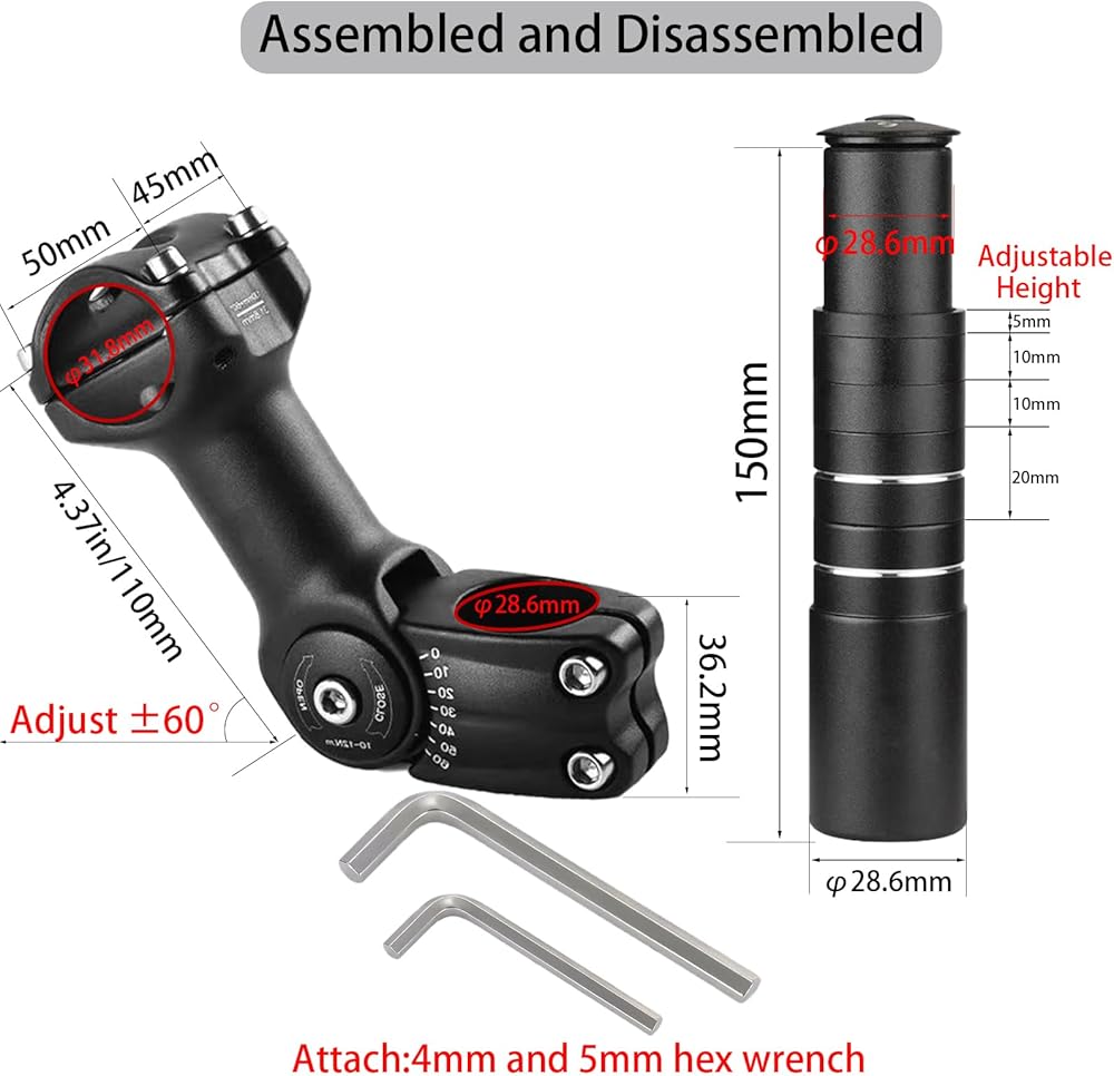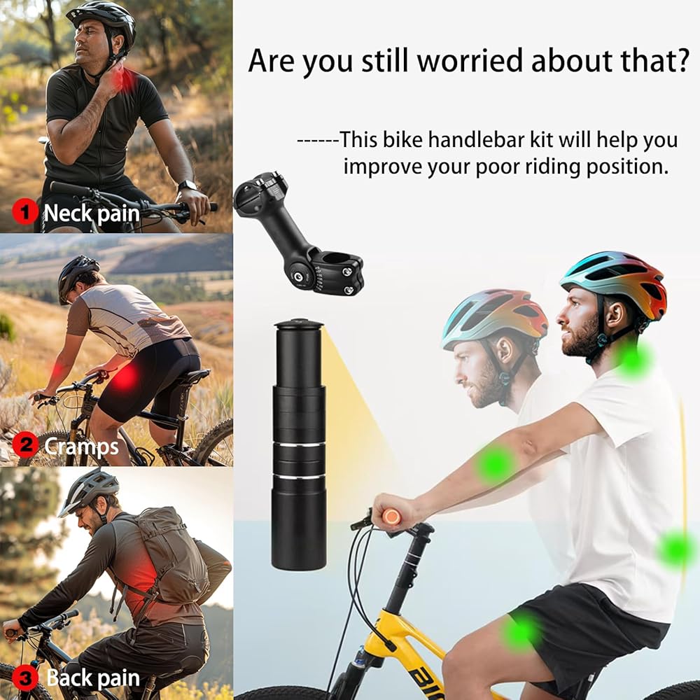 【Easy to Install】First, put the bike stem extender together, link one end to the bike fork and one end to the bike handlebar, and tighten the screws.Installation is very simple due to the exact specifications. There is an “angle” indicator on the adjacent part that allows you to set the angle correctly. There is an opening in the bar that allows you to see the position of the handlebars.