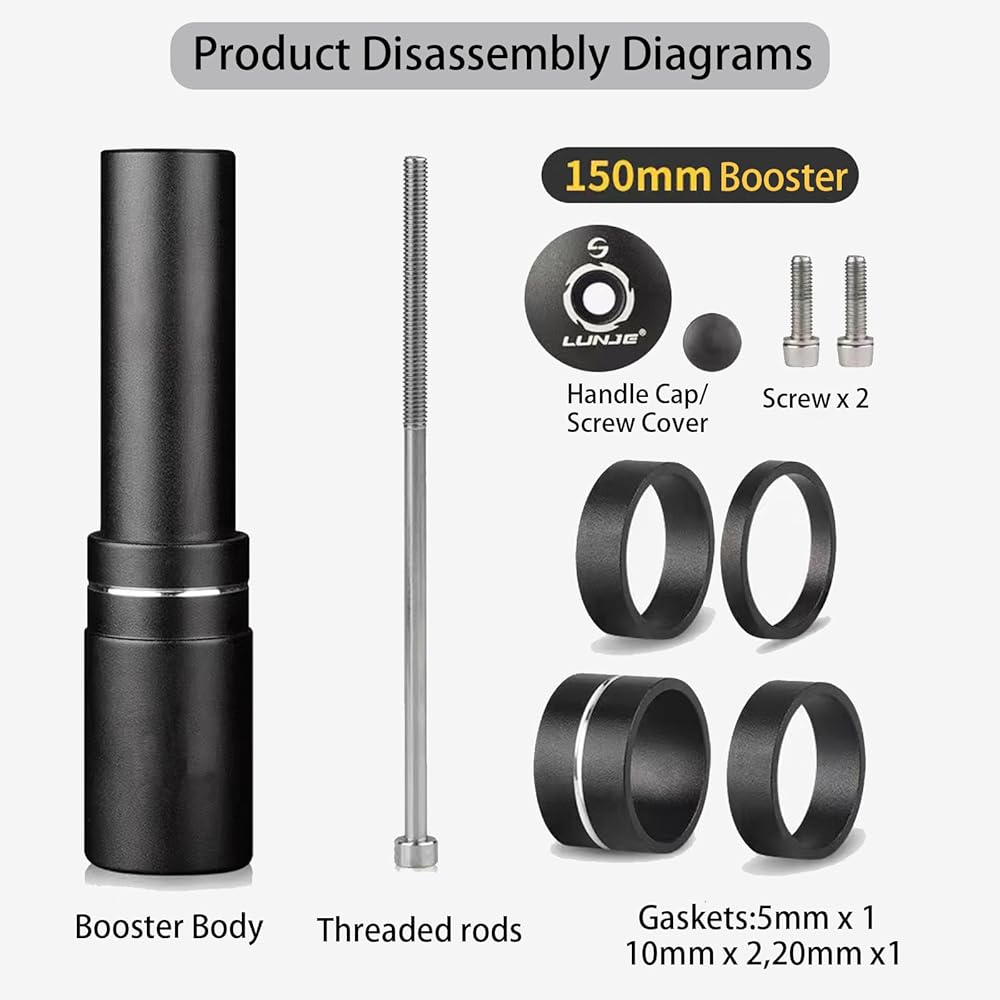 【Product Composition】This bicycle handlebar extender kit consists of two parts: a handle bar extension for bike and a fork extensions.Part contains washer 20mm x1,10mm x1 5mm x2, 2 hexagonal wrenches,a threaded rods,a handle cap and screw cover,6 screws.
