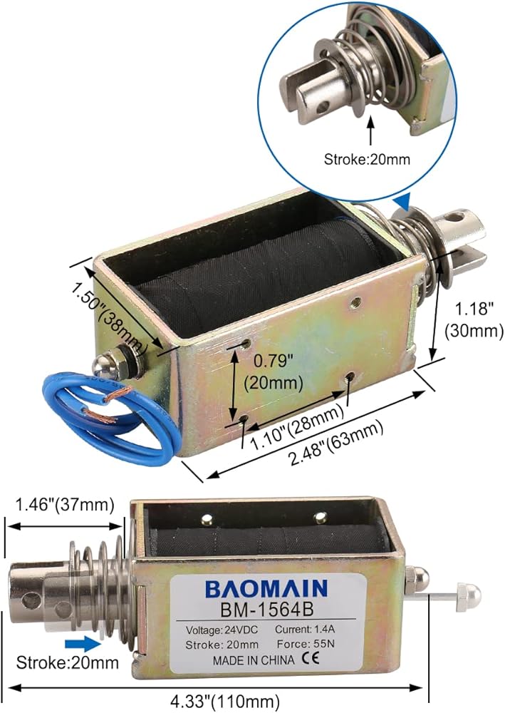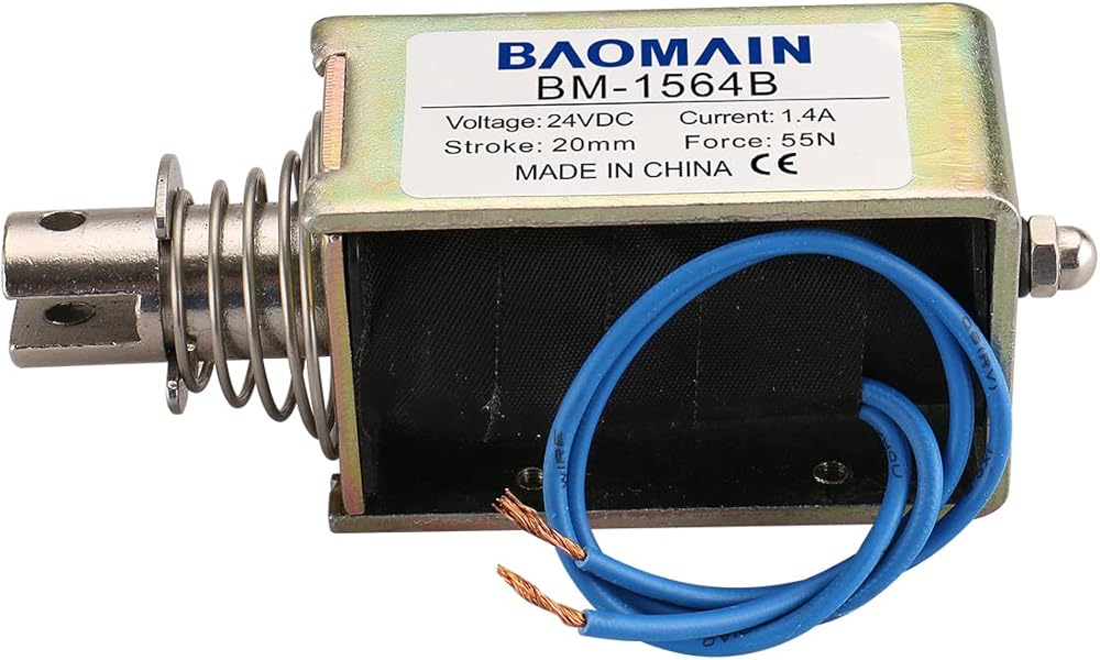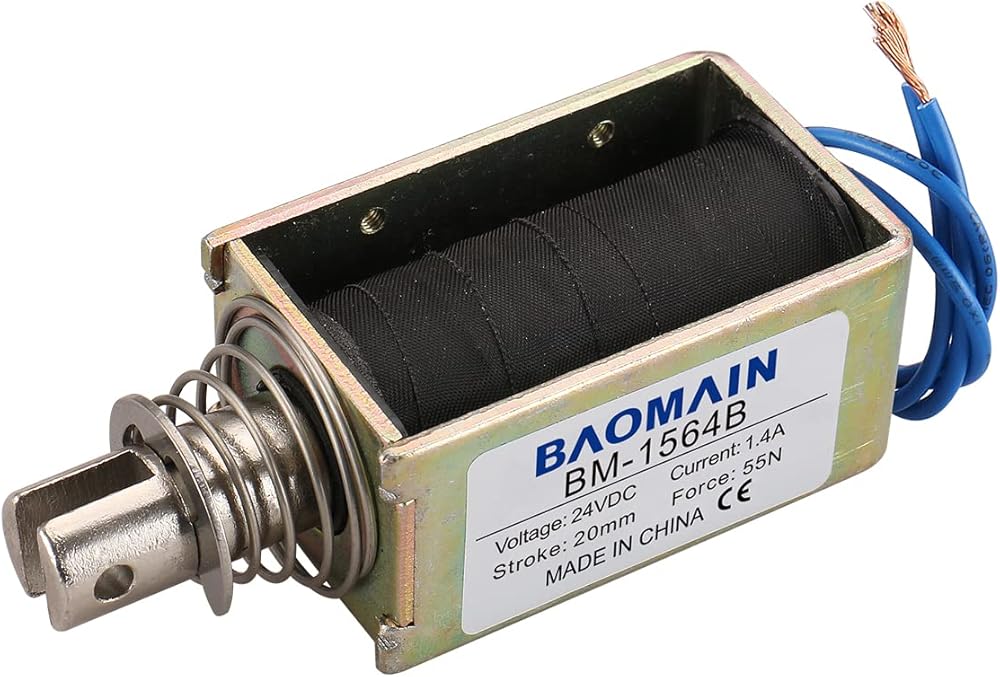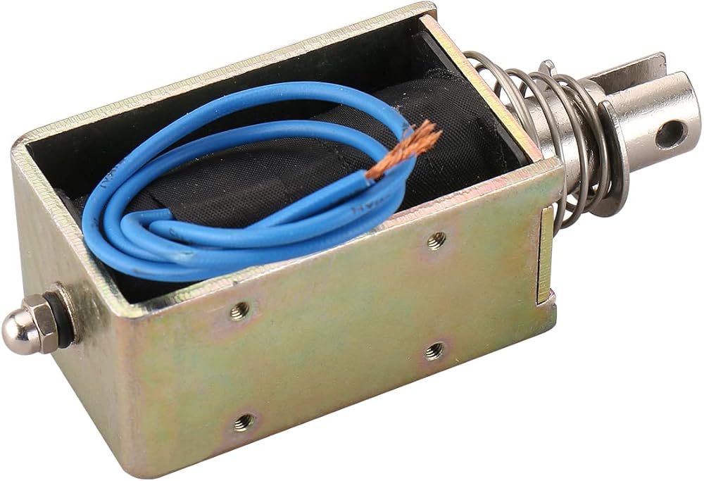 Pull push type, linear motion, open frame, plunger spring return, DC solenoid electronmagnet.