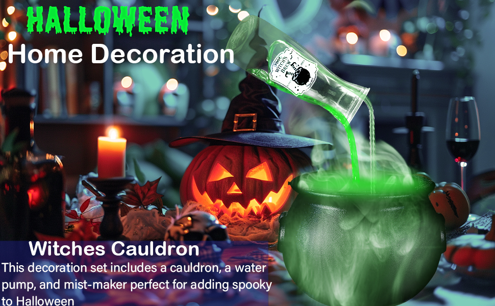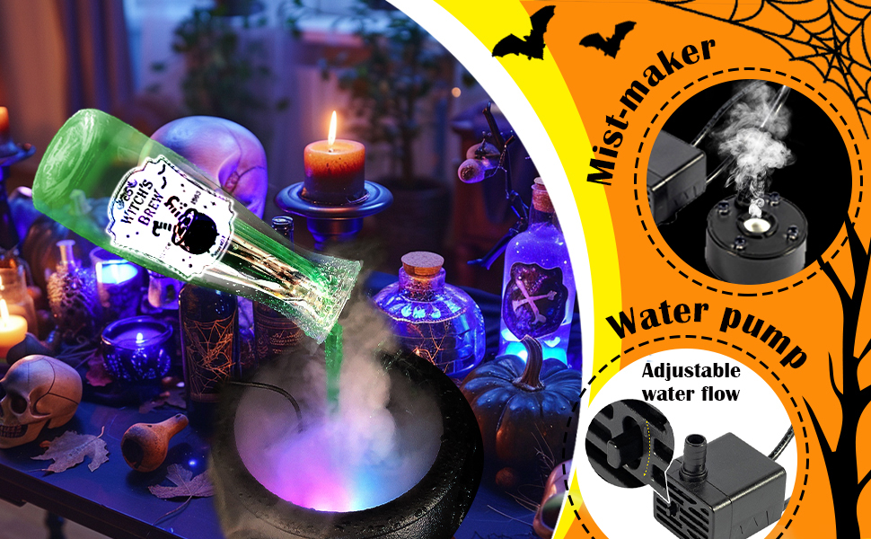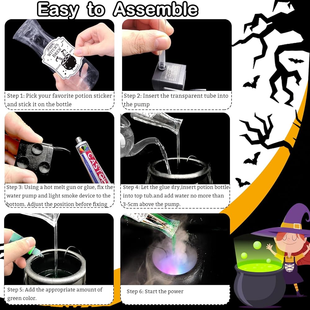 Easy to Assembly: Creating a glowing effect with smoke for the halloween witch cauldron is very simple! Just follow the picture to insert the tube into the clear bottle, add green potion to the cauldron, connect the water pump and mist-maker received, and assemble according to the instruction. This magical wizard cauldron is now ready to decorate every corner of Halloween.
