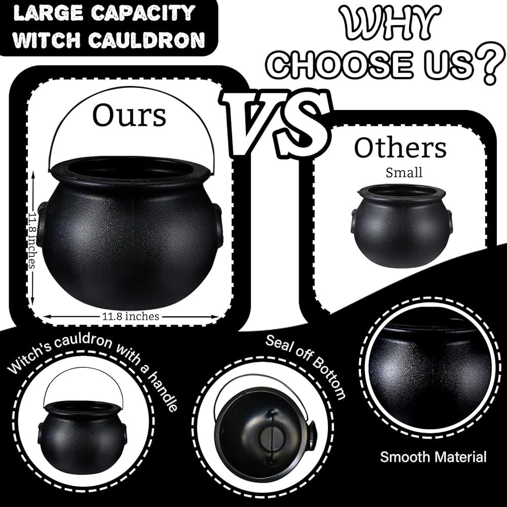 Valuable Witch Cauldron: This black plastic witch cauldron measures 7.6 * 5.3 inches and with a convenient handle design. Our witch cauldron is larger than others on the market, providing enough capacity for all your Halloween needs. Not only can this magical witch cauldron be used for potion decoration, but it can also be filled with any Halloween decorations or carried by children for trick-or-treating with the kids.