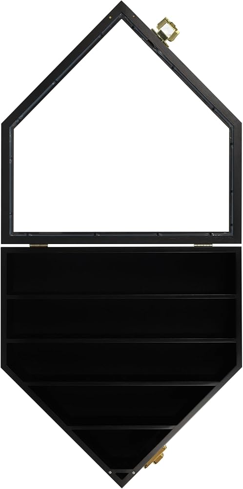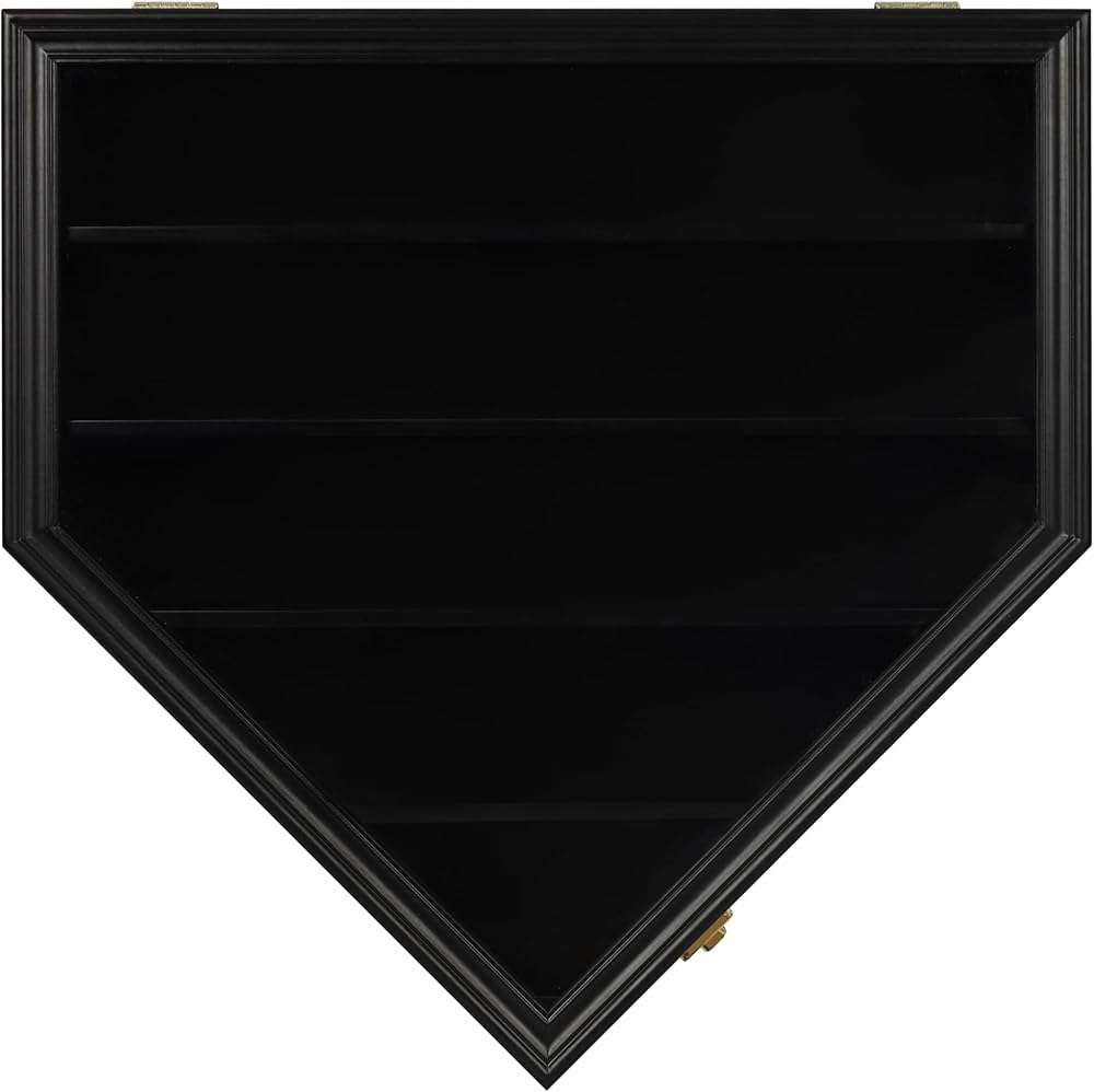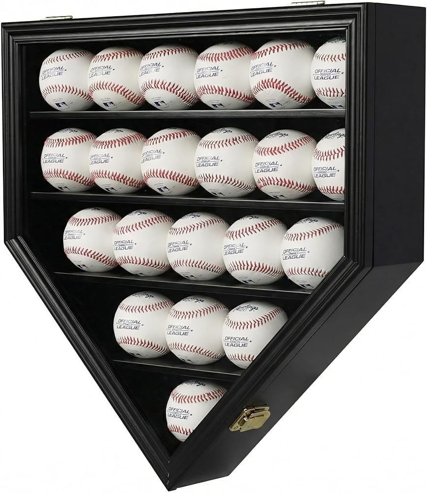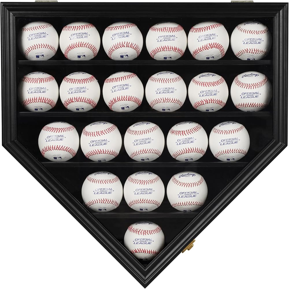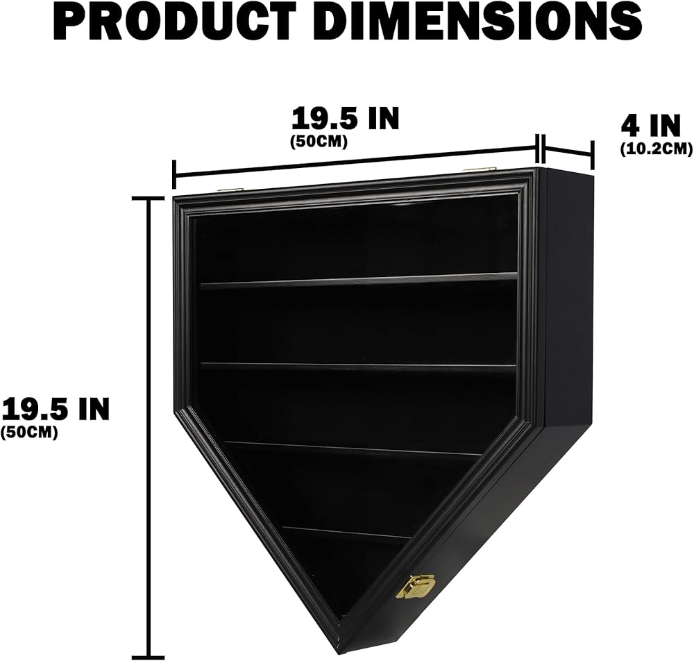 Dimensions: 19.5"H X 19.5"W X 4"D. Distance between rows: 3". Anti-fade lacquer finish baseball case display for 21 baseball, shatter proof acrylic glass panel baseball show case with 96% transparency, 98% UV protection, gold plated anti-theft locks, velvet like felt lining, indents to keep baseballs from rolling, Homeplate shape baseball cabinet holder, wall mount option. Wall Hooks included.