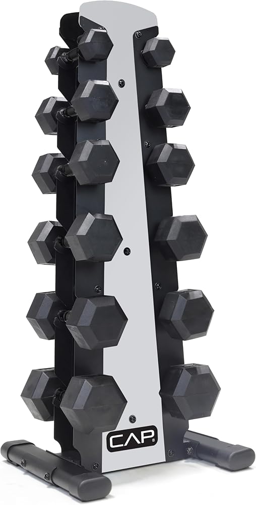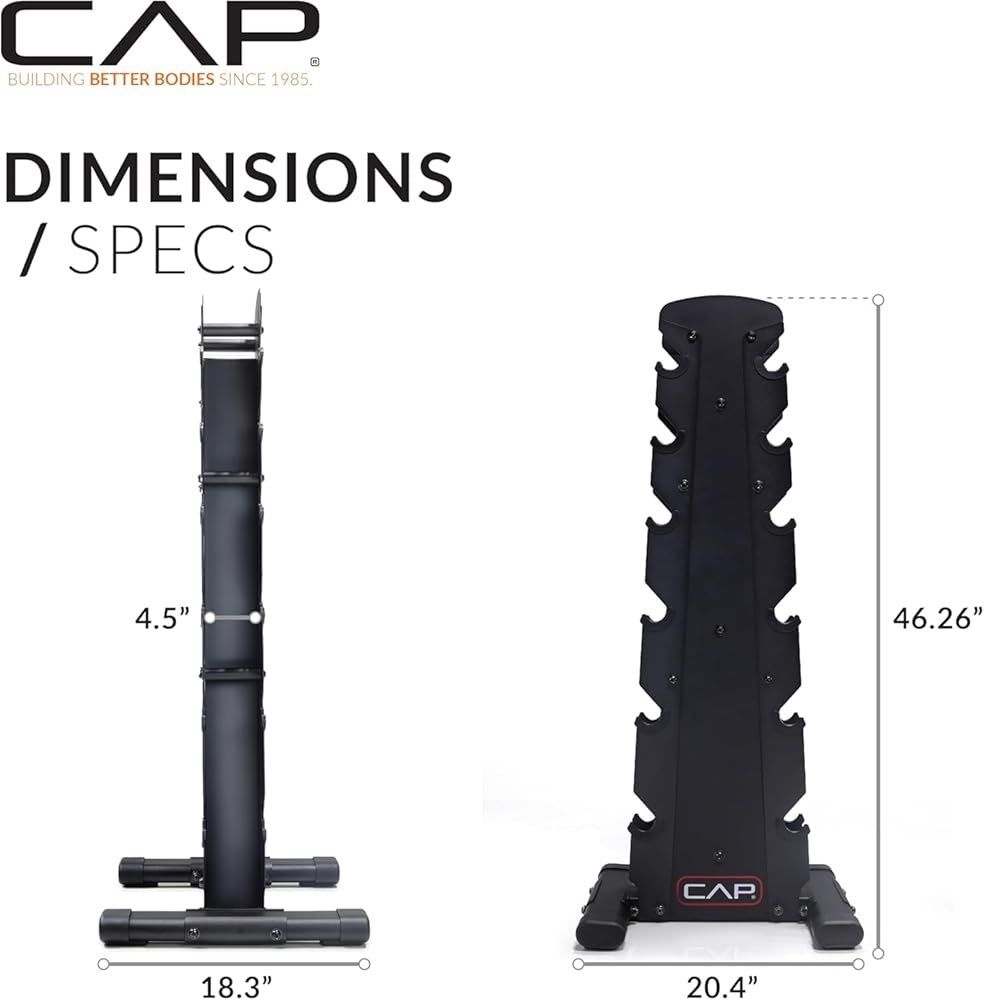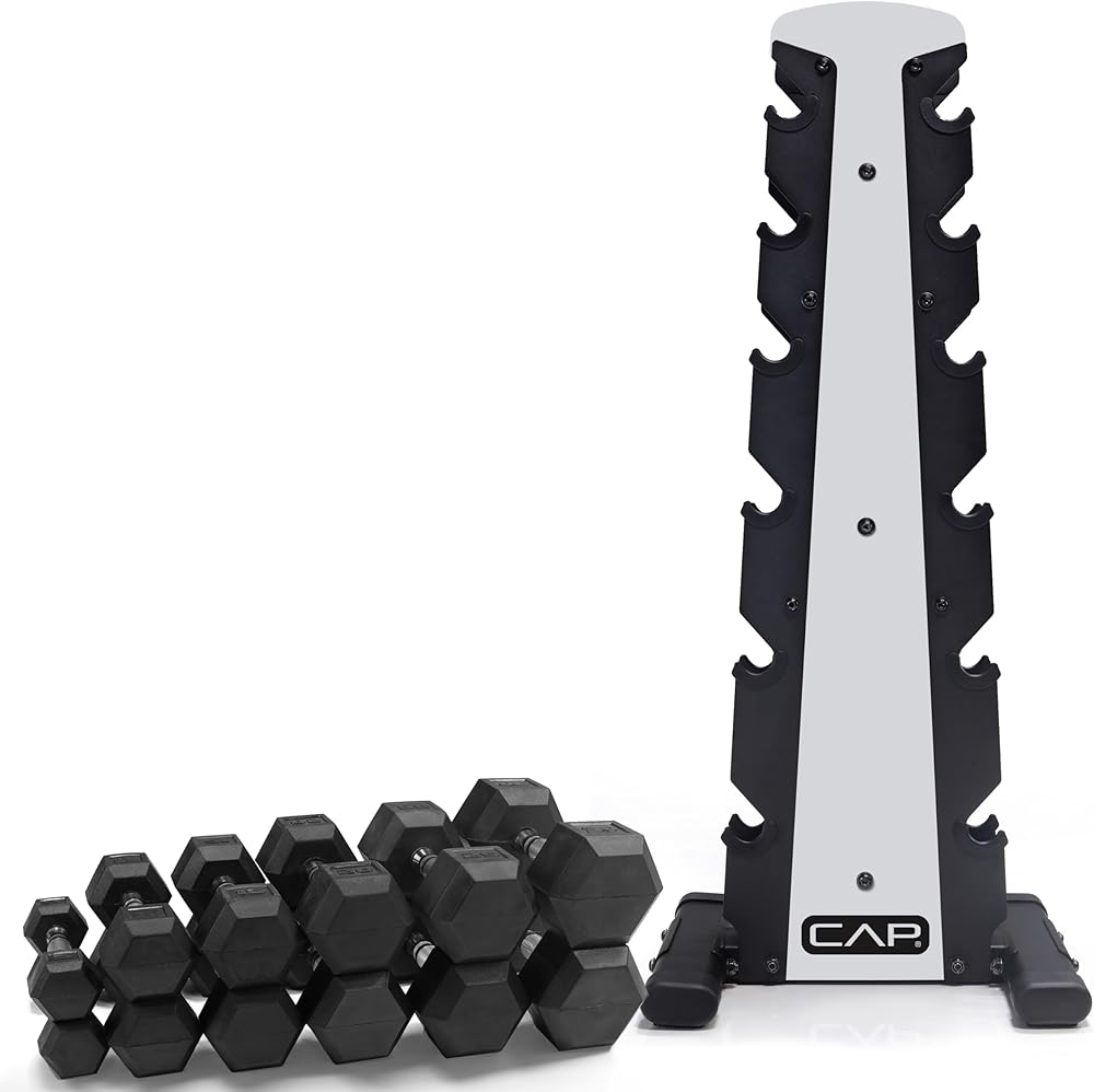 The CAP 100 LB Coated Hex Dumbbell Weight Set with A-Frame Rack will add versatility, storage space, and reliability to your home gym. This set includes a pair of 5-pound, 10-pound, 15-pound and 20-pound rubber hex dumbbell weights and an A-frame rack to store them. The FIVE pairs of dumbbells can be easily stored and accessed using the reliable, durable, space-saving A-frame rack. The dumbbell heads are made from ASTM A48 Class 20 grey iron coated in 80 shore hardness rubber joined together by a solid 1018 cold rolled steel chromed handle, making them durable and reliable. Use dumbbells to target specific muscle groups or add resistance to your strength training routine or HIIT workout. This set allows you to start with light resistance and build your way up to heavier weights, allowing you to attain the fitness goals you've set.