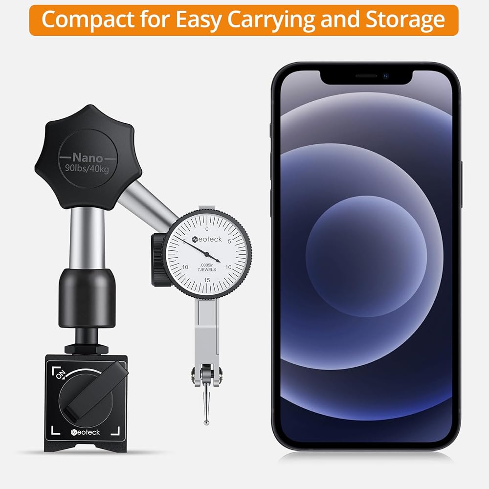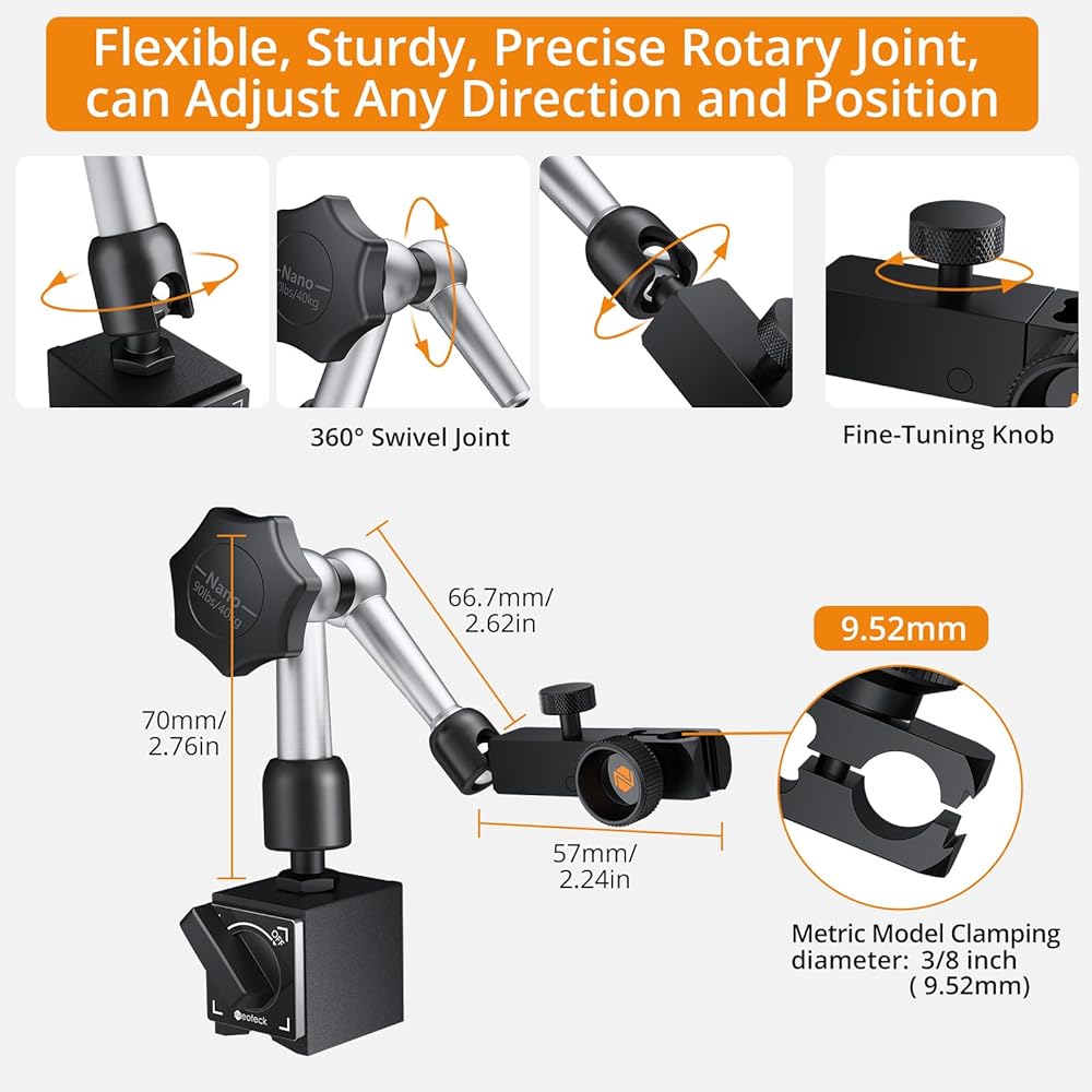 【Adjustable Holder Arm】With dimensions of 4.74" for the lower arm, 3.35" for the upper arm, Neoteck base includes a 3/8-inch clamping hole.Its flexible, robust and precise swivel joint allows for adjustment in any direction and position, offering high stability. Compatible with almost all dial or digital indicators, it provides flexibility, stability, and compatibility for diverse measurement needs