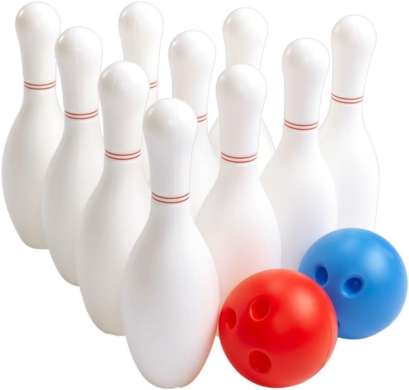 Strike! Encourage children to get up and move with this fun bowling set. This set includes 10 bowling pins, each measuring 12” tall, along with 2 bowling balls, each 4.5” in diameter, and one carry/storage case with handle for easy transport. Children will love rolling the ball to knock over the pins. Components are made of thick plastic, are easy to wipe clean, and made to last. For children ages 3 years and older.