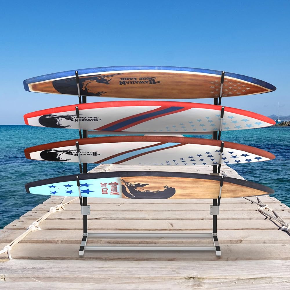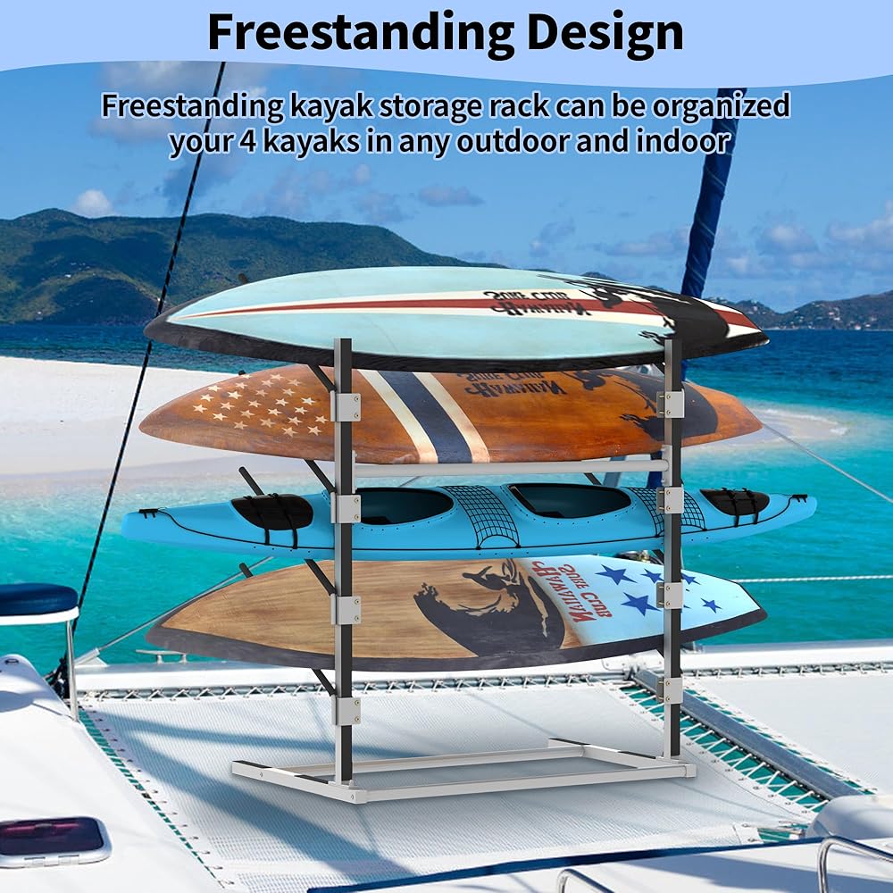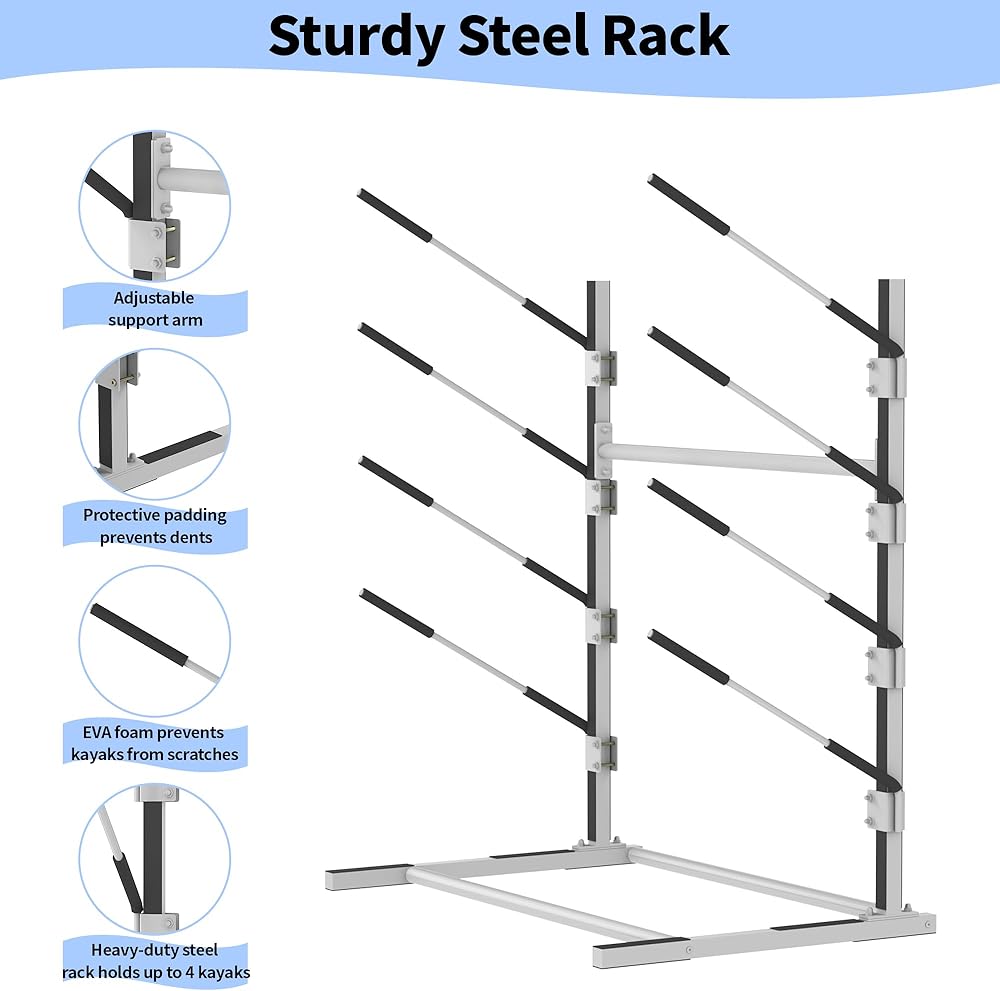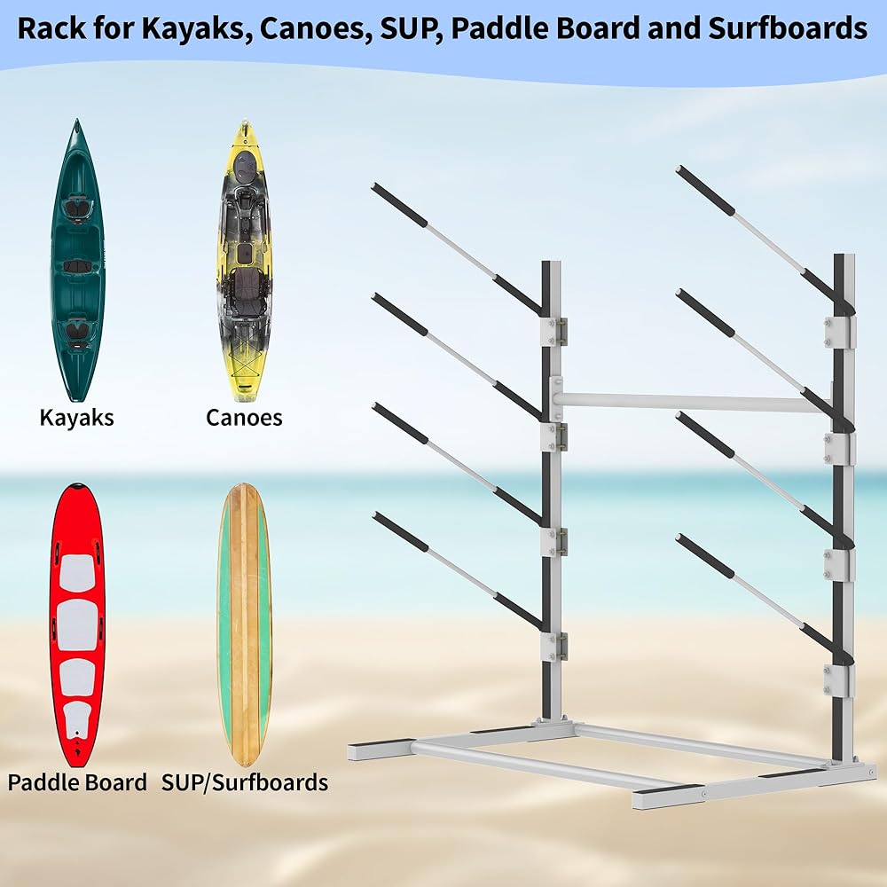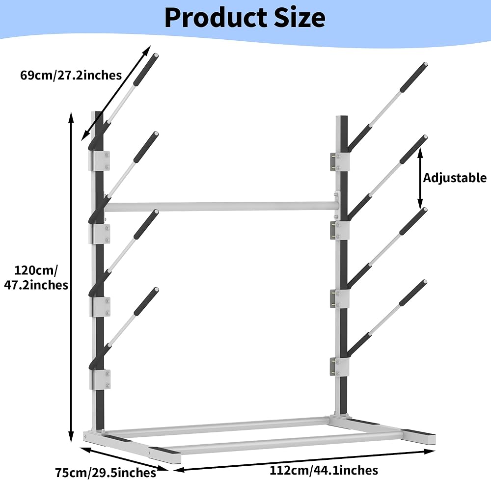 【Large Capacity】The storage rack can hold up to 4 kayaks, canoes, standup paddle boards, and surfboards and the size is 43.7x29.5x47.6inch. Also comes with features 4mm thick reinforced crossbars, so you don't have to worry about rocking.