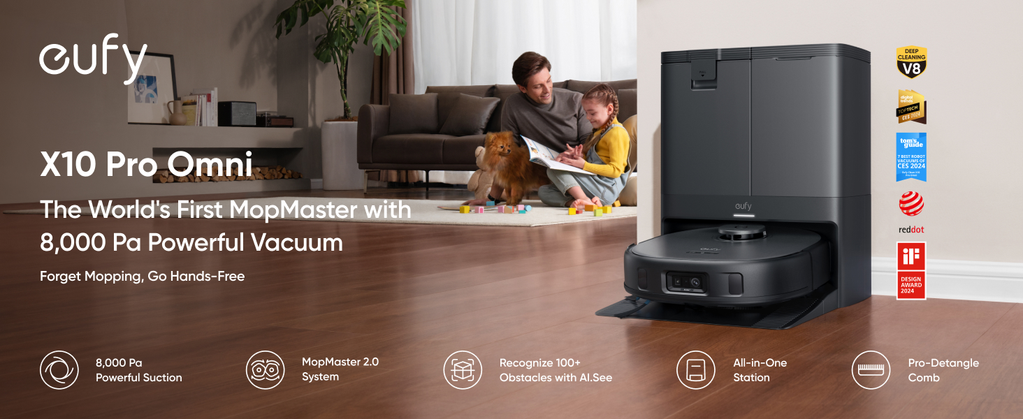Powerful 8,000 Pa Suction for a Deeper Clean: eufy robot vacuum X10 Pro Omni effortlessly removes hidden debris in carpets, including pet hair, for clean floors in just one pass.