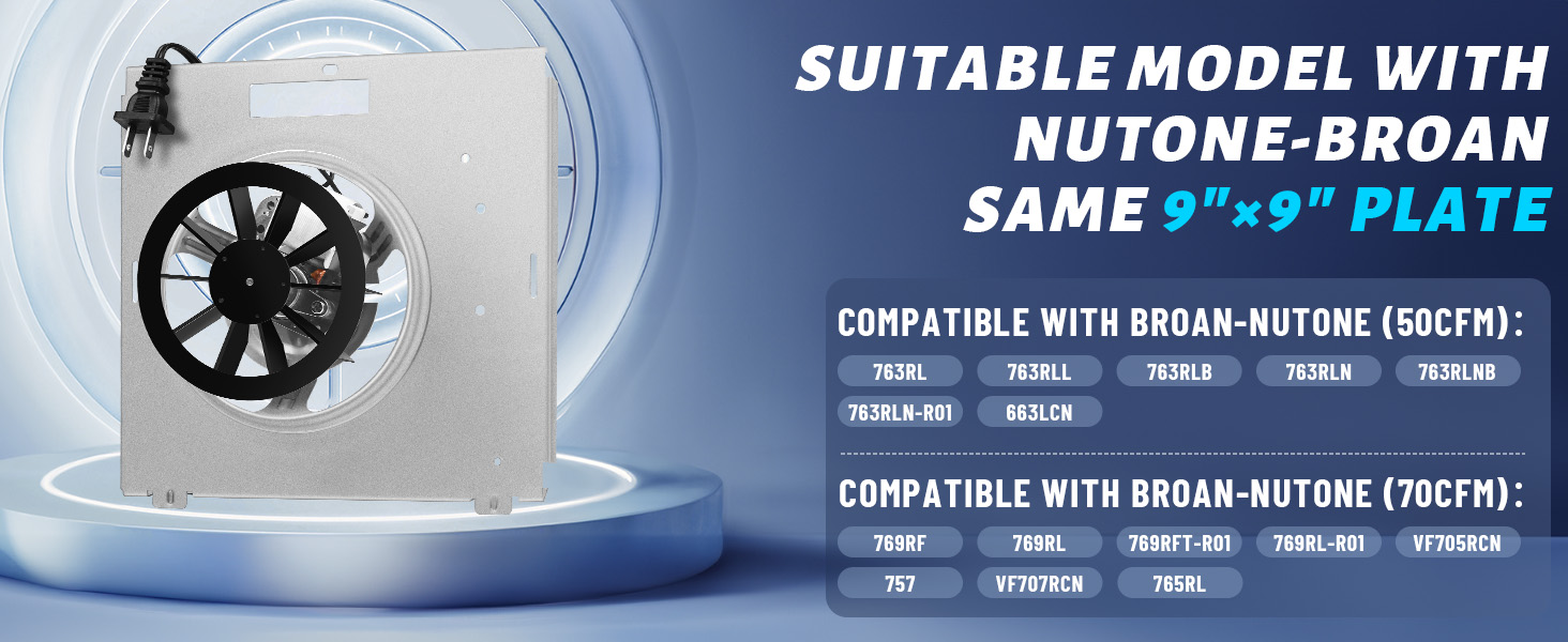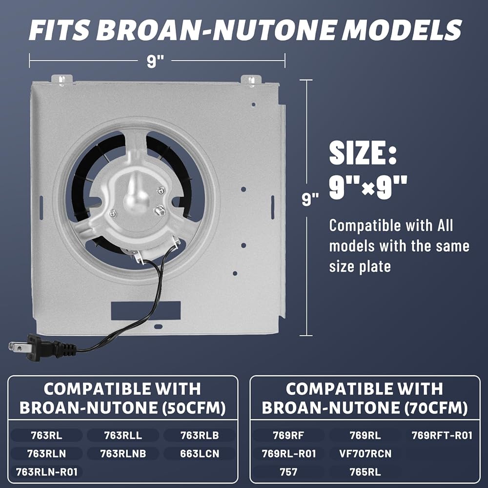 Wide Compatibility: Specifically designed to suitable with Nutone models 763RLN, 763RLL, 763RLN, 763RL,763RLN B, 763RLN-R01,756,VF705RCN, 663LCN,769RL and 769RF series, making it a versatile replacement option. this 50 CFM S0503B000 motor assembly fits perfectly with all fans that use a 9"x9" plate.