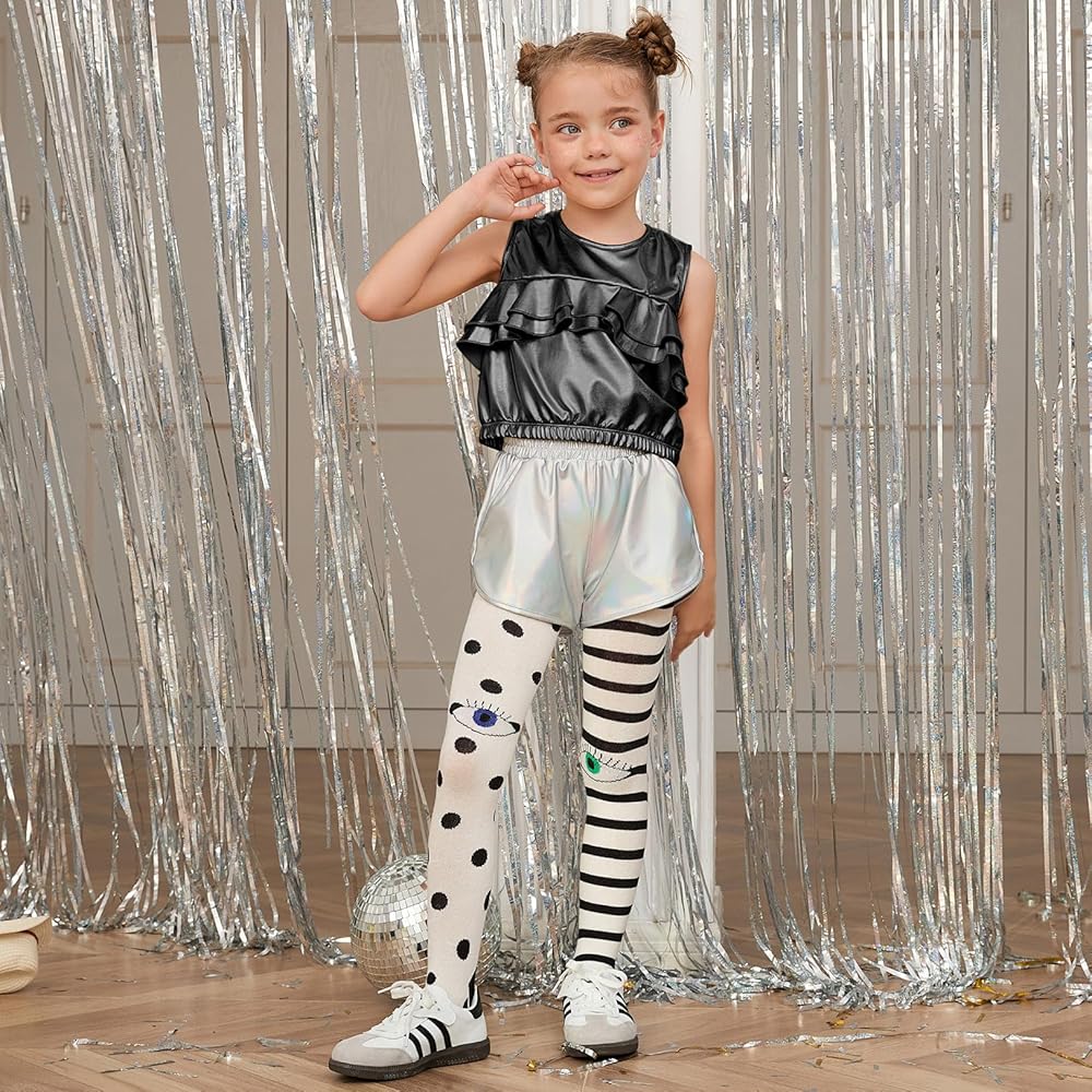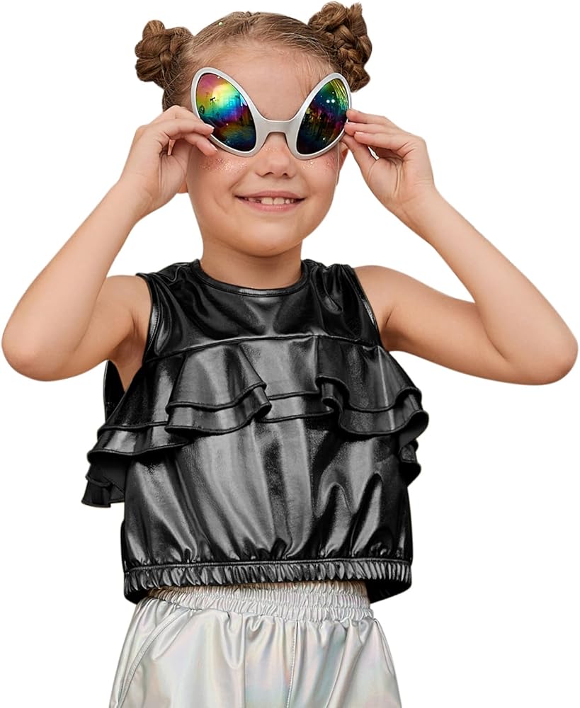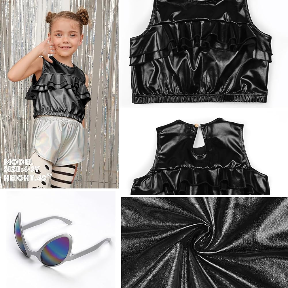Design: It includes a Metallic tank top and a pair of Halloween alien glasses. The crew-neck, crop top is designed to look stylish and simple, while the back neckline is buttoned up to make it easy for children to slip on and off