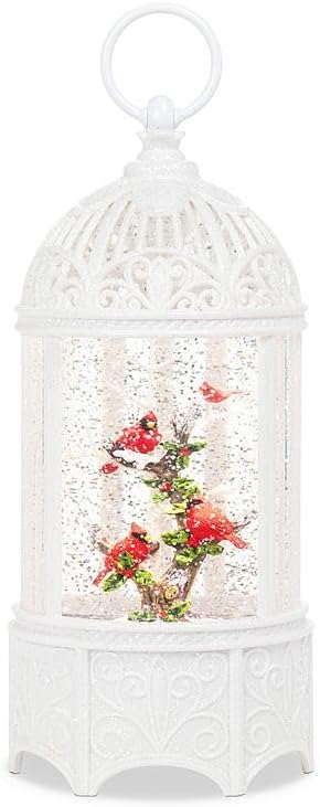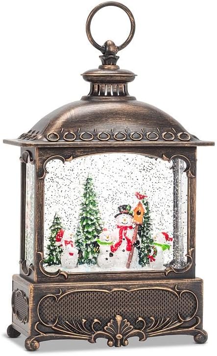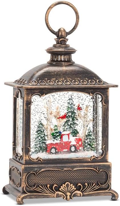 • This handpainted lantern not only showcases a festive scene, lights up and has a fan that delicately stirs shimmering glitter, creating a magical, snowfall effect. LED light is Warm White.