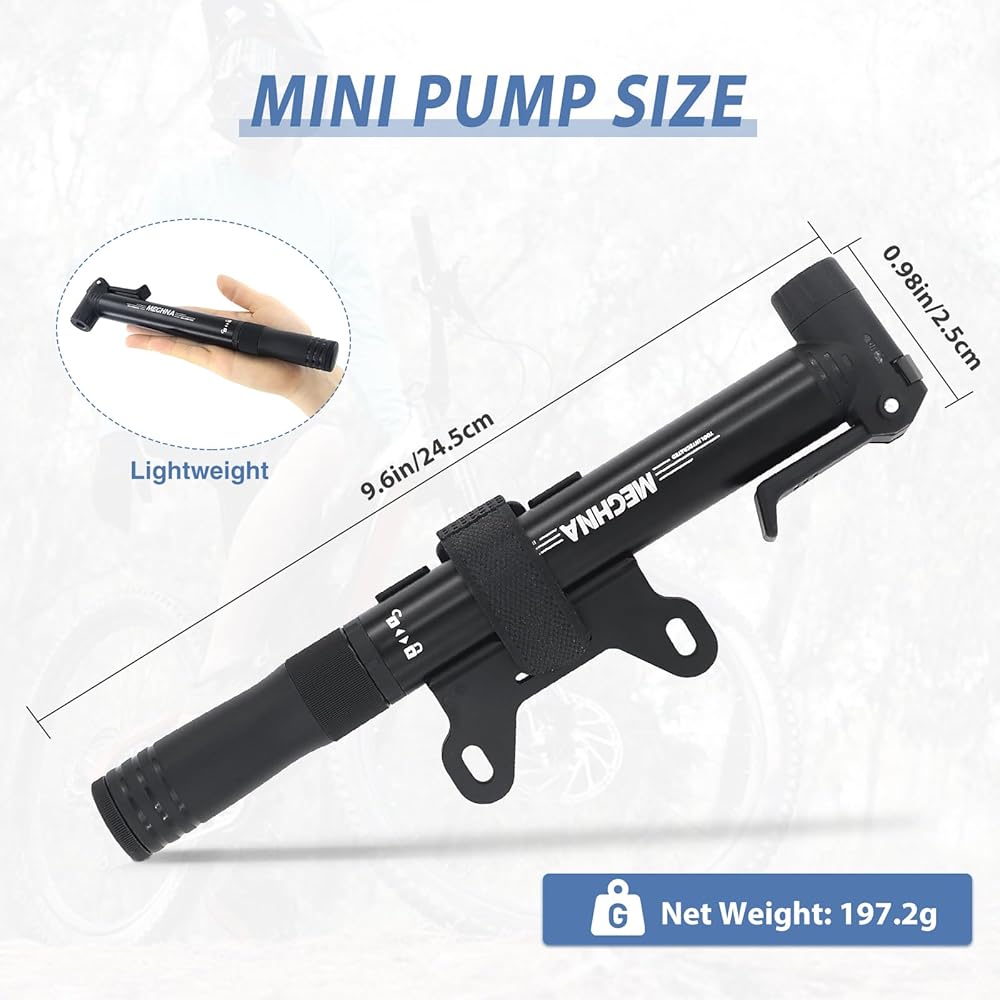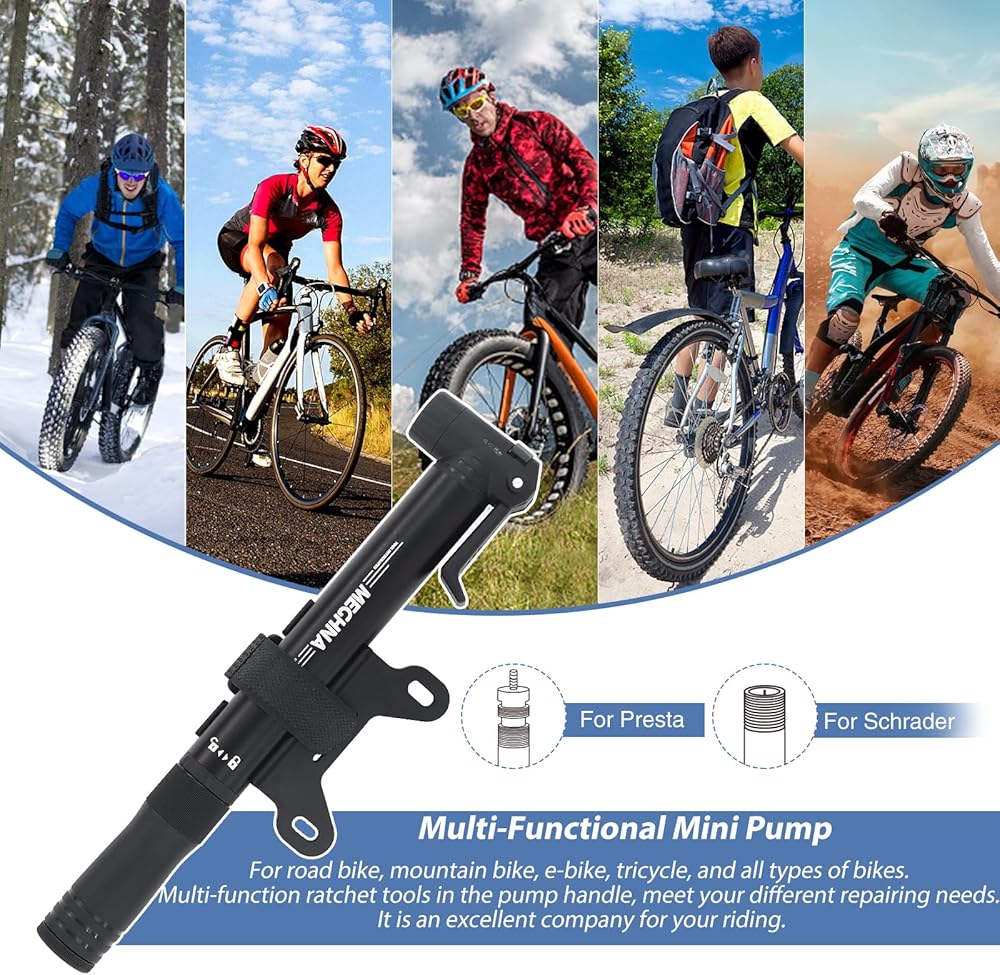 Mini Bike Pump Portable Bike Tire Pump Frame Mounted Air Pump Both Presta and Schrader Valves Bike Pump with Ratchet Tool for Moutain Bike Road Bike Hybrid Bike