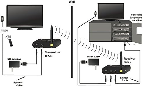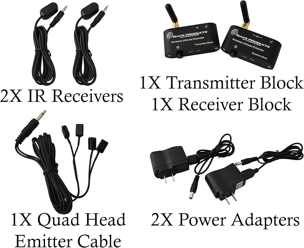 ⢠Hide your IR remote controlled devices completely out of sight! In another room, in the cabinet or wherever you can imagine! ⢠Does your remote control stop working if your cable box is 20' away but you want to put the cable box downstairs? Not a problem with our wireless remote control extender! ⢠Generally suitable for most homes 3-5,000 SQFT or less. Our wireless IR extender can span 50-300ft, depending on your homes contstruction which can reduce the distance it may span. ⢠Sit and change channels on the cable box while the box is in the basement and your upstairs. ⢠Simple to follow setup video, helpful technical support and an awesome, 1 Year manufacturer warranty from BAFX Products!  The *ALL NEW*BAFX Products Wireless IR Repeater Kit / remote control extender! Complete your A/V setup with ease! This handy little kit allows you to hide all your IR controlled A/V equipment behind closed doors, or in another room all together, while still being able to control them with your current IR remote controls! (Does not support RF only remote controls, such as some Roku players) Rather than sending the IR signal via cables & wires like our standard IR repeater kits, these kits repeat your IR commands wirelessly! With our brand new wireless kit, there is no need to run a wire from the IR receiver end of your setup to where the devices are located. Simply plug the IR receiver end in the room where you want to control your devices from and plug the emitter end into an outlet near the devices you are trying to control and then attach one emitter head to each device! Simple as that! No more messy wires to run through walls or floors! IMPORTANT: More than one wireless kit may be used per home however, if you have two devices that both can be controlled with the same remote control, please be aware that if they are both connected to the repeater kit, they will BOTH respond to the commands coming from the repeater kit! Comes with a fenominal and easy to use 1 Year warranty against manufacturing defects from BAFX Products® Specs: ⢠Transmitting distance 50-300ft (walls/floors will reduce distance) Generally suitable for homes 3-5,000SQFT or less depending on home construction ⢠Distance of IR receiver from remote control, up to 25' ⢠5V power What's included: ⢠2X IR Receiver ⢠1X Quad head emitter cable ⢠2X Power wall adapter ⢠1X Transmitter block ⢠1X Receiver block ⢠Link to setup video ⢠Manual ⢠1 Year manufacturer warranty against defects (Please note, this IR repeater kit will only send remote control IR signals, you will still need to run a line for you actual A/V signals) WATCH THE SETUP VIDEO BELOW!  Â