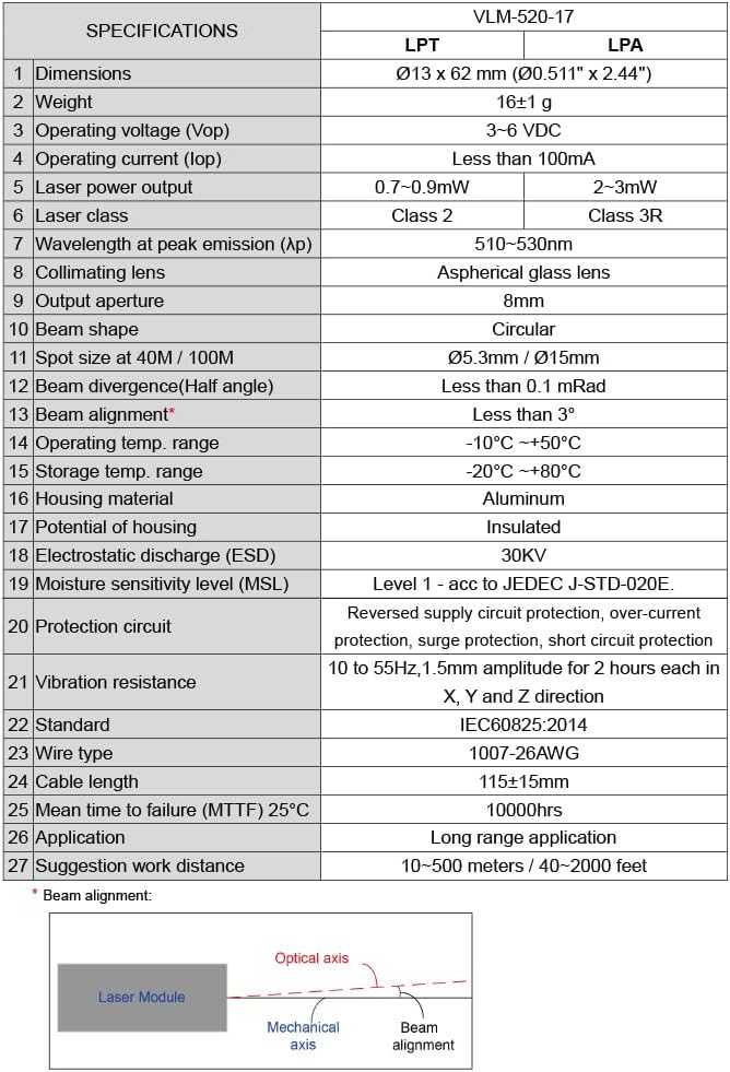 Wave length: 635±10nm. Output power: Class II – less than 1mW. 3~5 VDC operation. Beam Divergence (Half Angle) : <0.1 mRad. Dimensions: D13 x 50 mm (D0.511 x 1.96 inches).