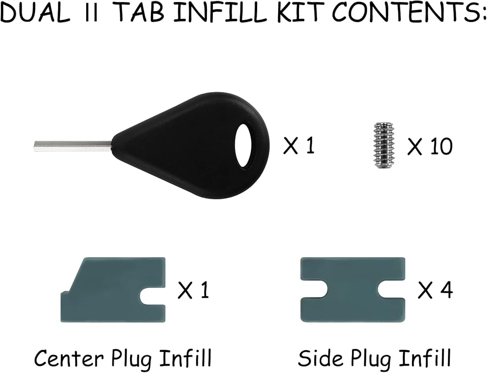 Include-Centre Compatibly Infill (x1), Side Compatibility Infills (x4), Grub Screws (x10), Fin Key (x1), Reusable zip lock bag