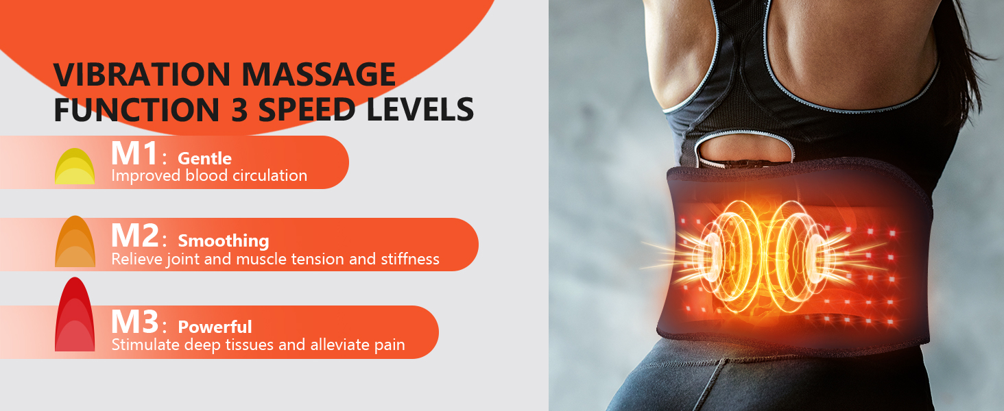 Heating Vibration Massage Mode: HALIDODO massage belt uses a unique three speed vibration and thermal therapy to massage deep tissues, which can more effectively alleviate various types of lower back pain and post exercise soreness. There are five heating zones, which can improve blood flow and recovery, providing you with comprehensive heat.