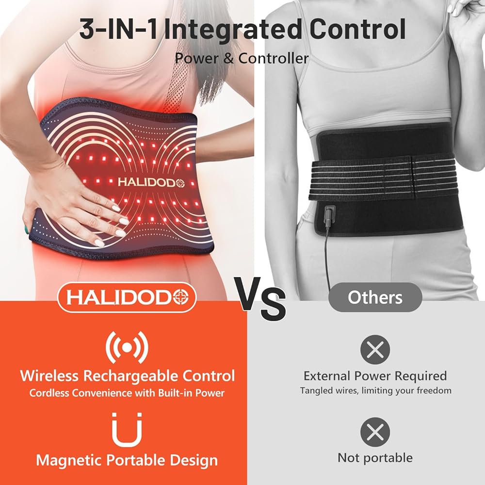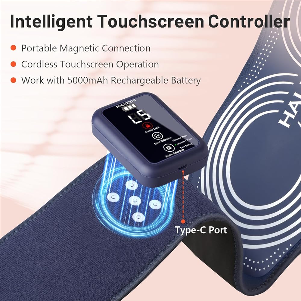 Wireless& Intelligent Controller - Unlike traditional red light belts, the power controller of the HALIDODO belt comes with a built-in 5000mAh battery, allowing you to break free from the constraints of power cables. Large capacity battery design, with an average operating time of 1-2 hours after fully charging the device. Intuitive touch screen controller design, allowing you to freely choose from 6 red light modes and 3 massage modes, making it easy to customize your treatment.