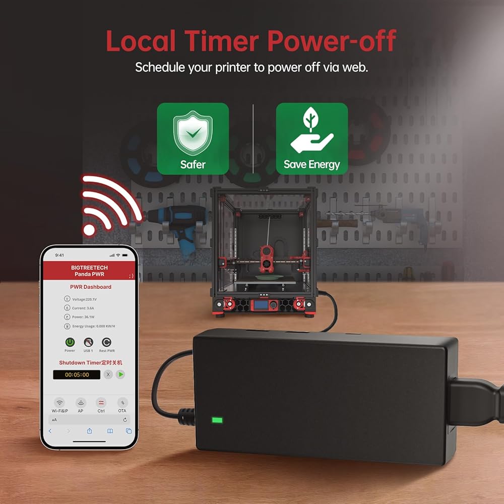 【Local Timer Power-off】With local countdown shutdown capability, you can schedule your printer to power off with BTT Panda PWR even when lose connection with internet. It helps a lot in saving energy and boosting your 3D printing ROI. Effortlessly adjust the shutdown timer from the web UI on your phone or PC for a smarter and greener printing experience!