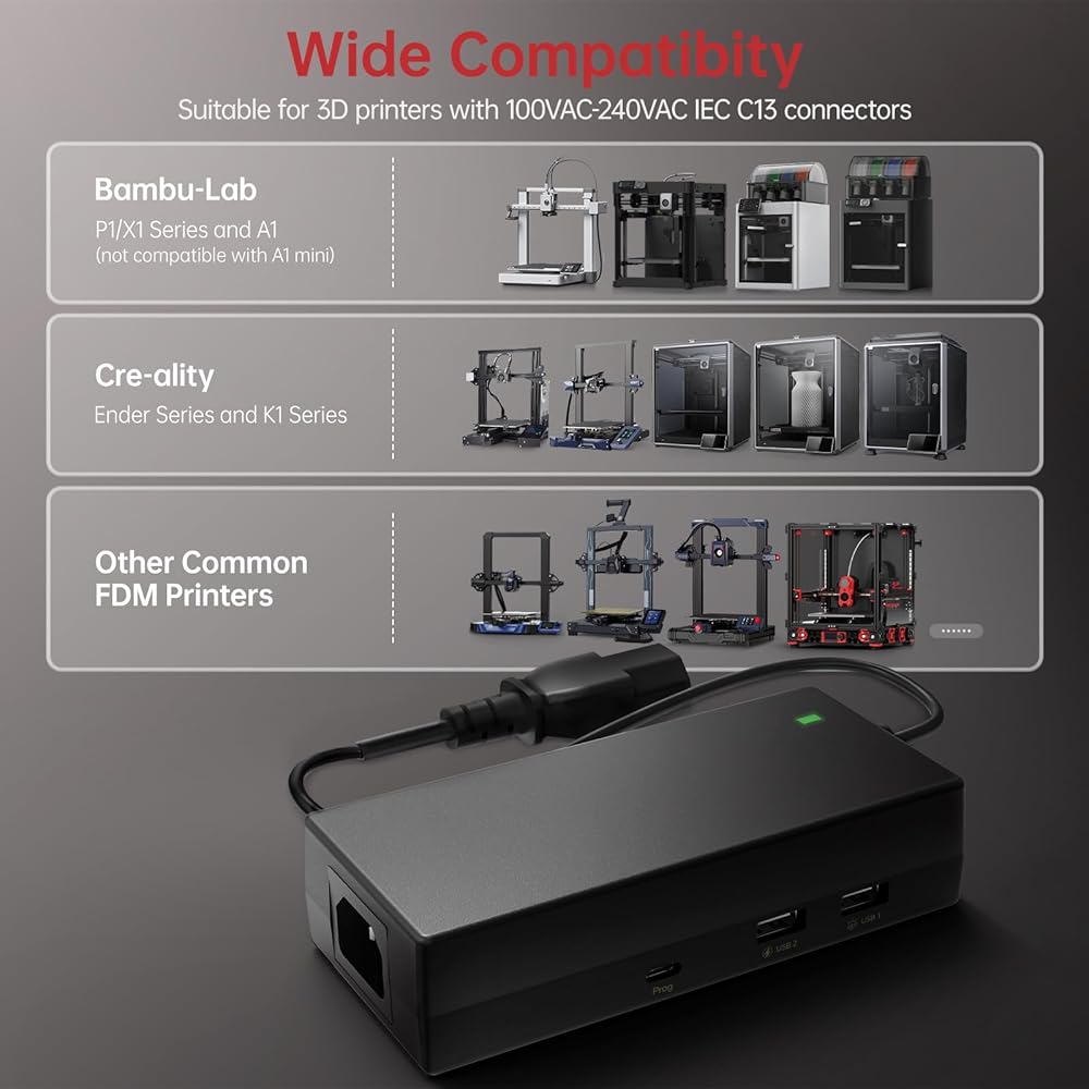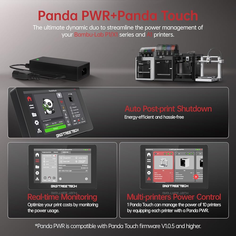 【Wide Compatibility】BIGTREETCH Panda PWR is compatible with all FDM 3D printers whose connector is 100VAC-240 VAC IEC C13, such as: Bambu Lab Series-X1X/X1E/P1S/P1P/A1; Cre-ality Ender Series and K1/K1C/K1 Max; Neptune 3/Neptune 3Plus/Neptune 4...; Kobra 2/Kobra 2 Pro...; BIQU B1/B1 SE/BX/Hurakan. For Bambu-lab printers, you can control Panda PWR via Panda Touch or web UI. For other printers, you can only control via web now, or via BTT K Touch with its next firmware update.