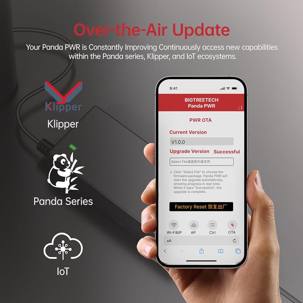 【OTA Update】Panda PWR is designed to be evolve. With upcoming OTA updates, it will continually integrate with Klipper firmware and IoT ecosystems, becoming more powerful and versatile over time. Panda PWR is much more than just a power manager; it's your ultimate home assistant, making your 3D printing journey smoother, more effortless and more efficient! Stay tuned for an ever-growing range of features!