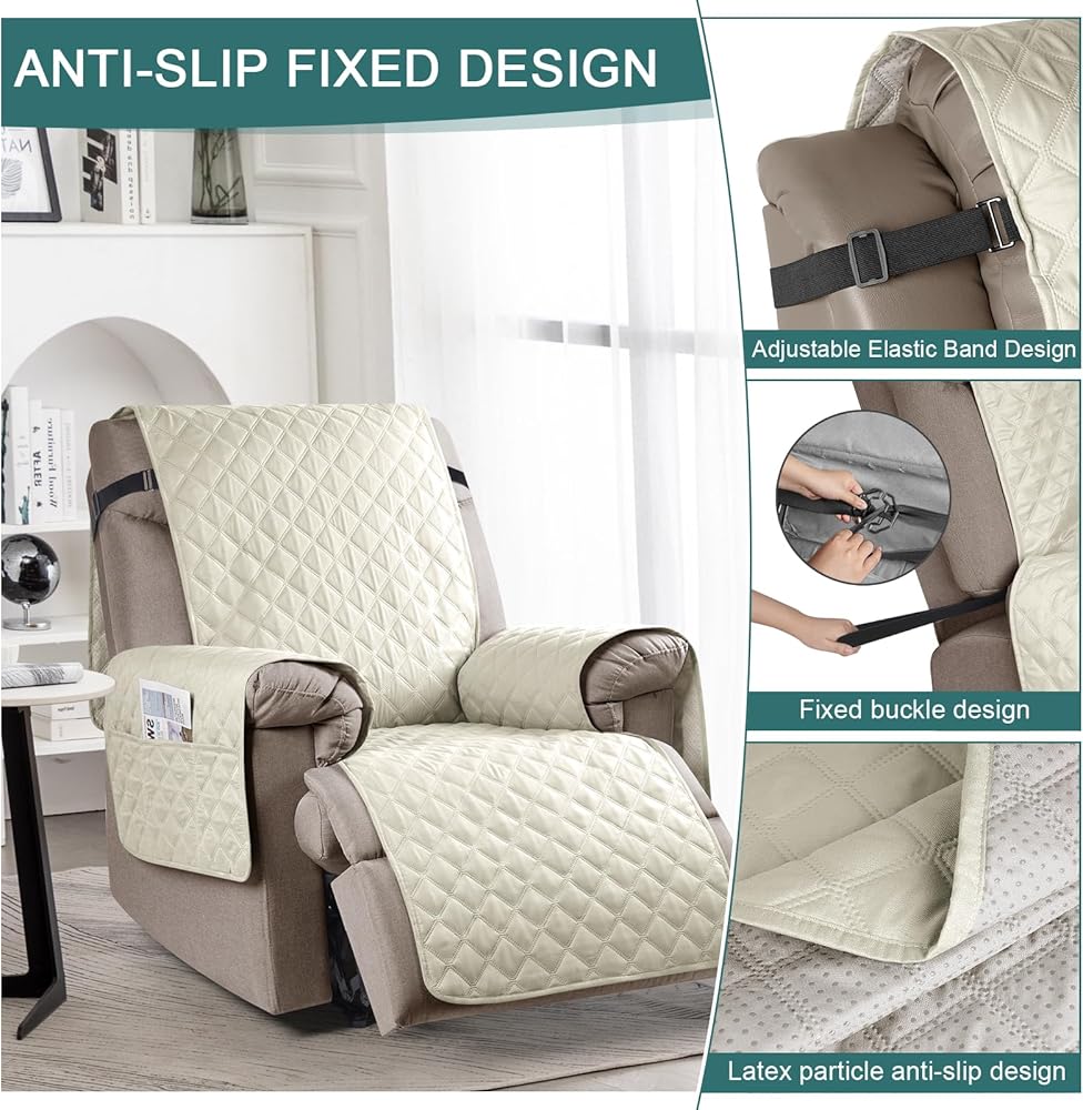 Ruaozz 100% Waterproof Recliner Chair Covers, Non-Slip Reclining Covers for Recliner Chair Washable Chair Cover, Recliner Covers with Pockets for Kids, Dogs, Pets (Ivory, 23'')