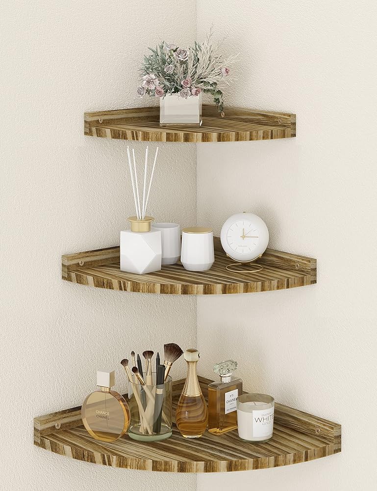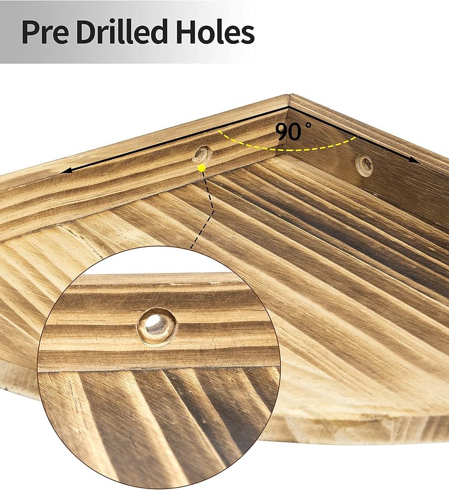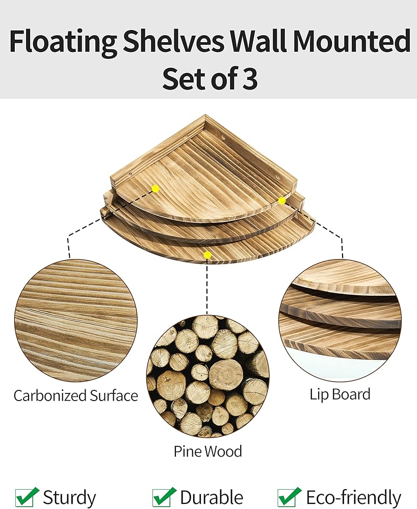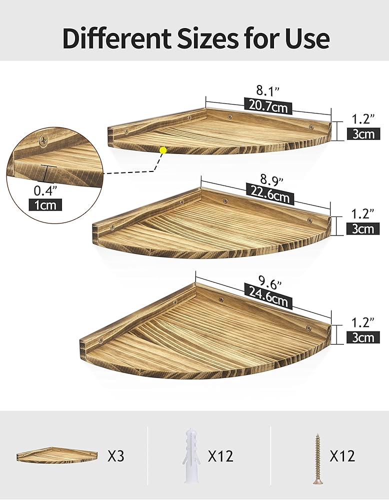 【Easy Assembly】: Package including 3 pack rustic corner shelves, 12 pcs screws, 12 pcs wall anchors. You can finish installation follow instructions in 5 minutes