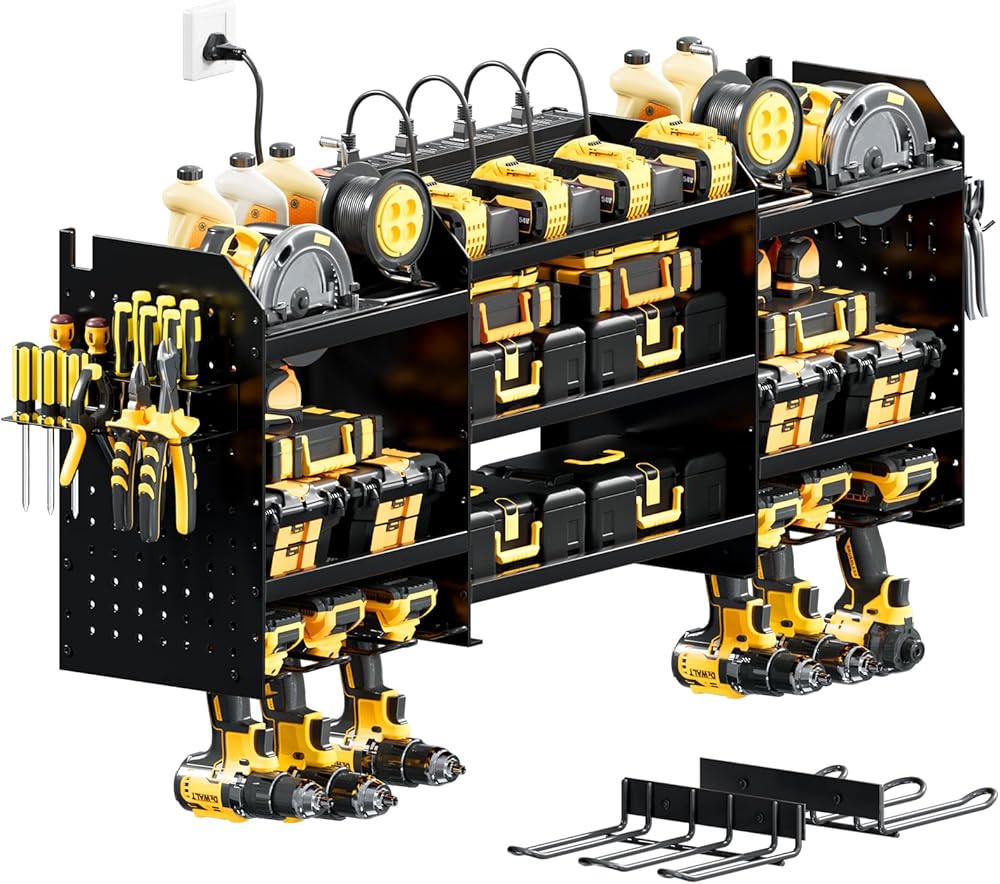 [High-Capacity Storage]Wall mount power tools organizer features 10 drill holder, alongside a built-in power strip. Its double layer structure keeps rechargeable tools organized in the work area, saving bench space. Notably, the spacing between the middle tiers is significantly larger than typical market offerings.