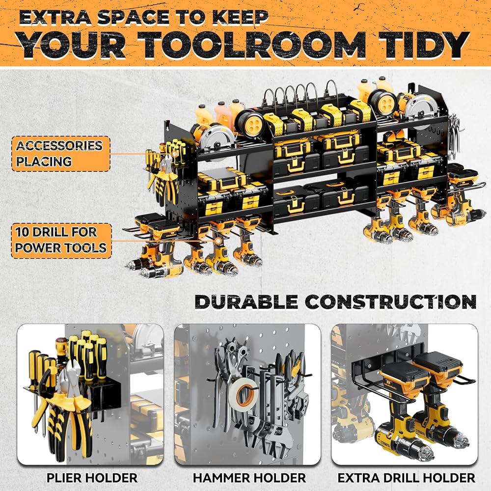 [Perfect Garage Companion]Utilizing wall-mounted installation, this power tool rack maximizes unused wall space, saving time in tool retrieval. Ideal for garages, homes, workshops, sheds, backyard shops, and more, it offers suspended tool organization and storage.
