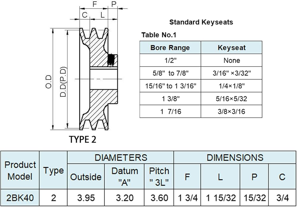 2BK40-3/4, 2BK4034 v Belt Pulley,3.95 inch OD, 3/4 Inch Bore,Cast Iron Material, BK Double Groove Motor Pulley for "4L" or "A" Belts and "5L" or "B" Belts
