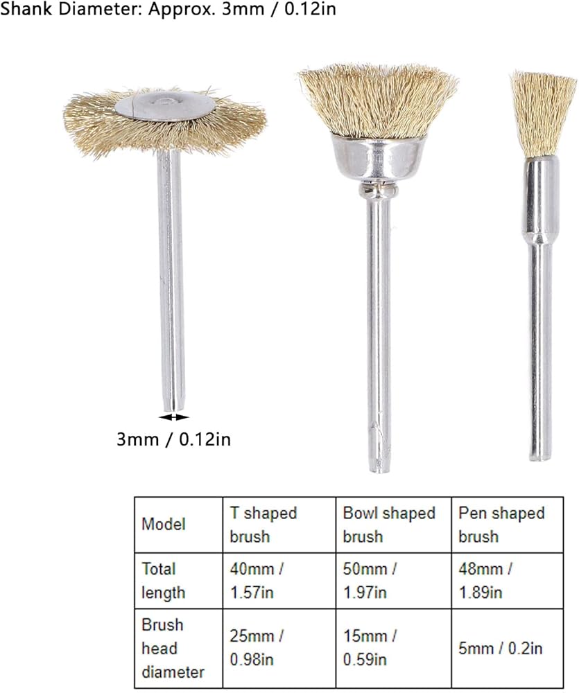Model T shaped brush Bowl shaped brush Pen shaped brush Total length 40mm / 1.57in 50mm / 1.97in 48mm / 1.89in Brush head diameter 25mm / 0.98in 15mm / 0.59in 5mm / 0.2in