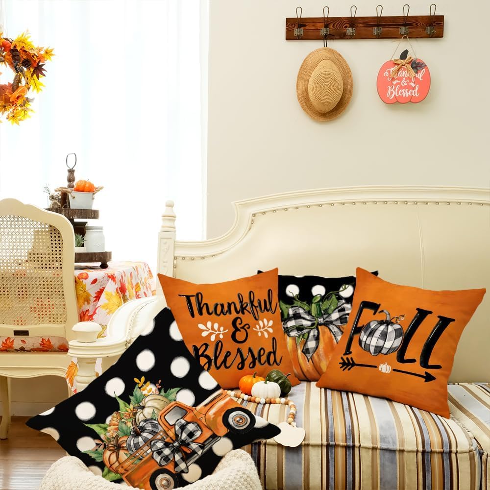 GEEORY Fall Pillow Covers 20 x 20 Inch Set of 4, Polka Dots Buffalo Bow-Knot Pumpkins Truck Thankful Thanksgiving Decor Decorative Throw Cushion Cases Decoration for Home Sofa Couch (Black) G405-20
