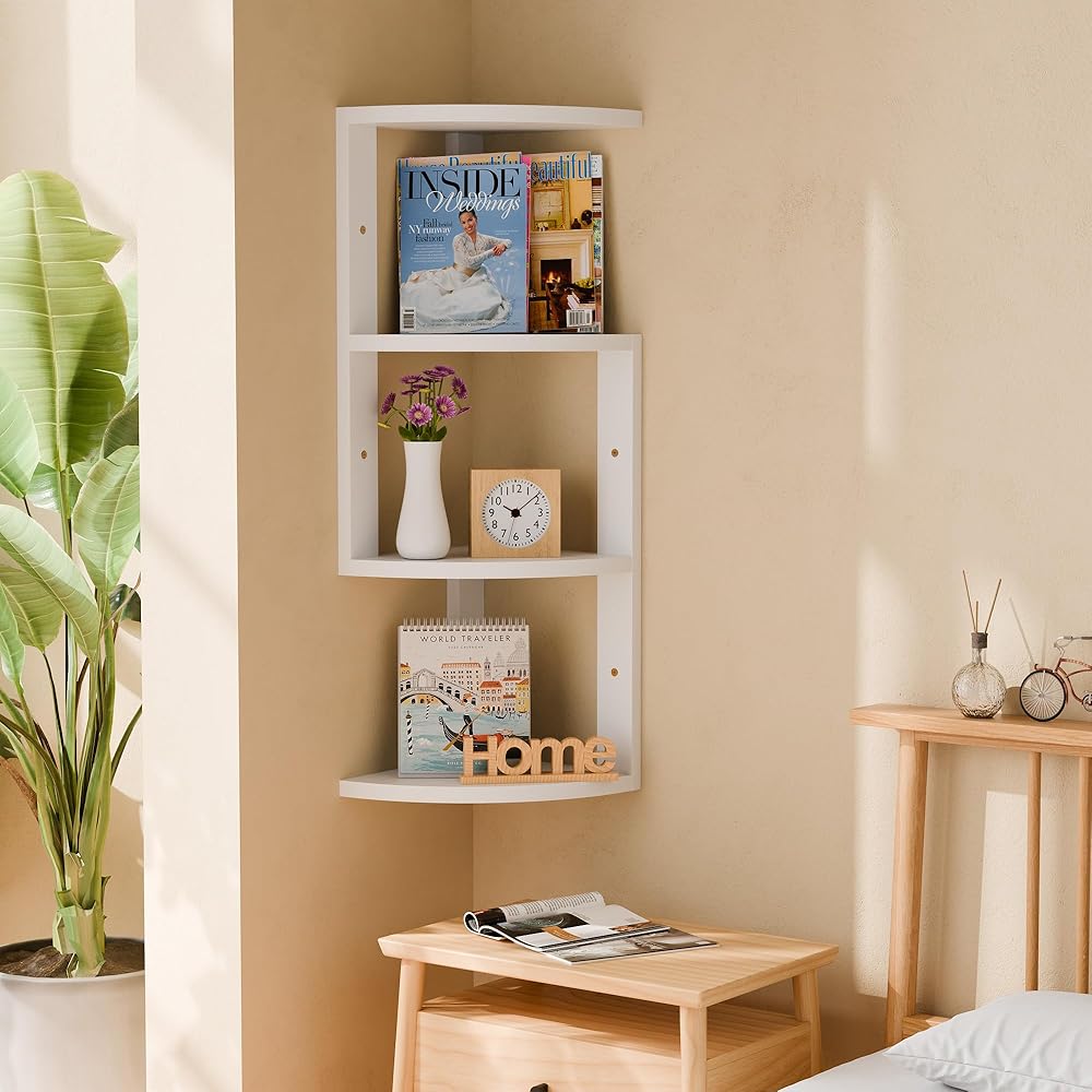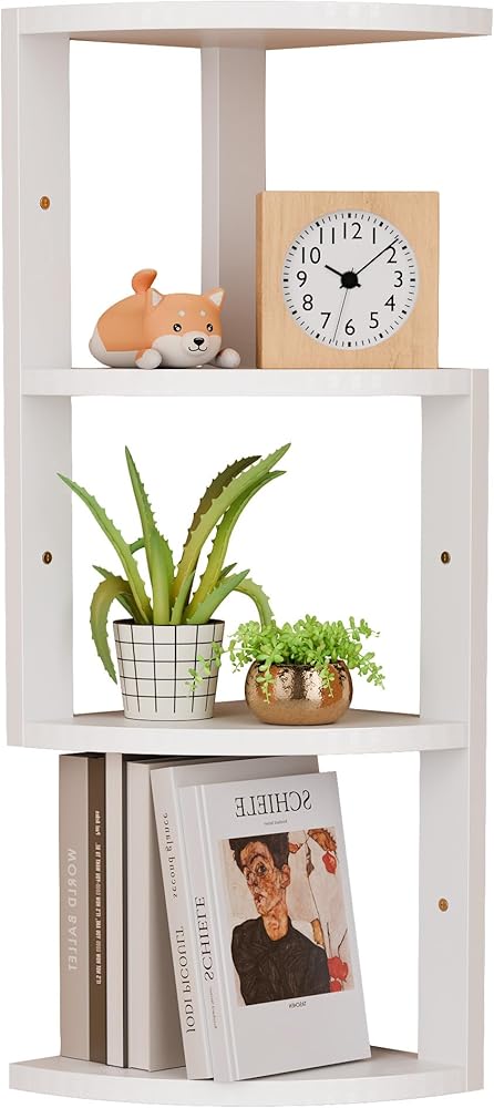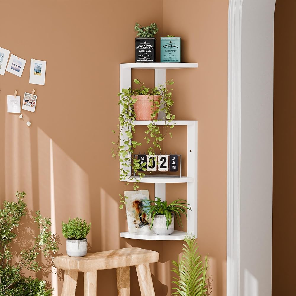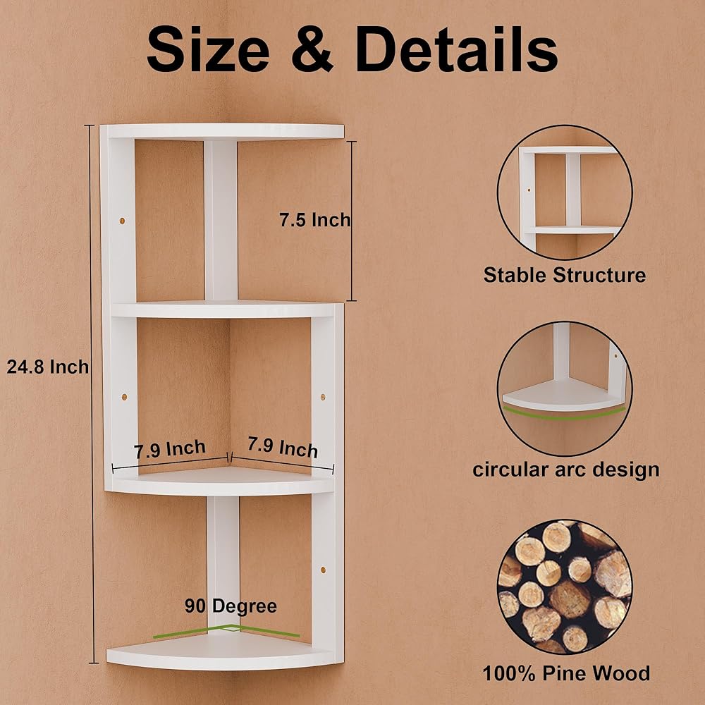 【4 tier Corner Wall Shelf】The height of the corner shelf stand is 24.8 inches, the shelf radius is 7.9 inches, and the space between shelves is 7.5 inches, this tall shelf provides you with ample storage space to store your books, photo frames, figurines, decorations, centerpieces, potted plants and other household items.