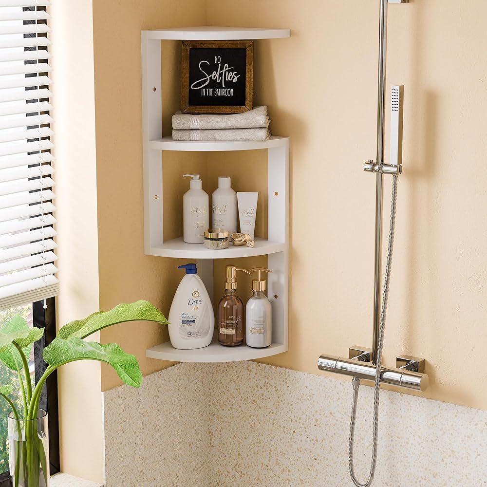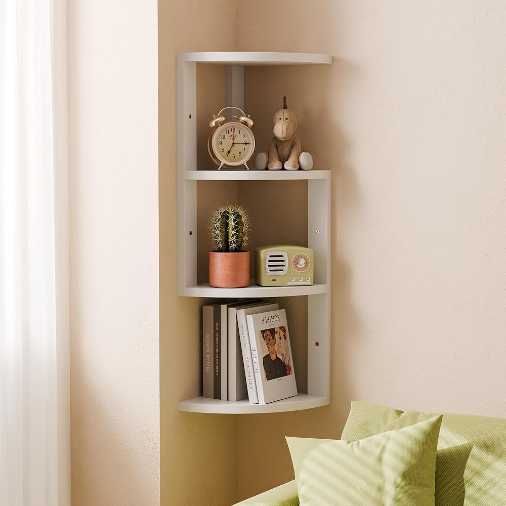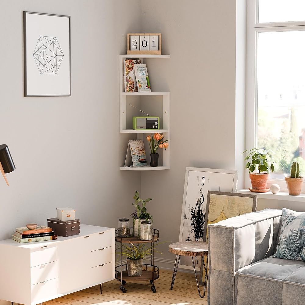 【4 tier Corner Wall Shelf】The height of the corner shelf stand is 24.8 inches, the shelf radius is 7.9 inches, and the space between shelves is 7.5 inches, this tall shelf provides you with ample storage space to store your books, photo frames, figurines, decorations, centerpieces, potted plants and other household items.