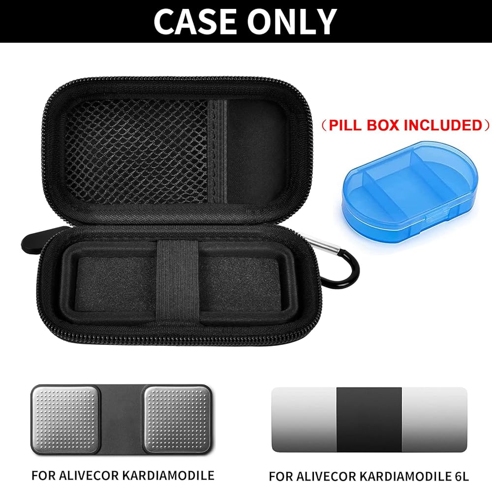 Case for kardia mobile heart monitor: Storage holder with pill box customized for KardiaMobile/ Sec 1-Lead Personal EKG Monitor, after removing the inner sponge also fits for KardiaMobile 6-Lead Personal EKG Monitor. External size: 4.73*2.36*1.45inches.( For sale is bag and pill box only, not include any heart rate monitor or accessories.)