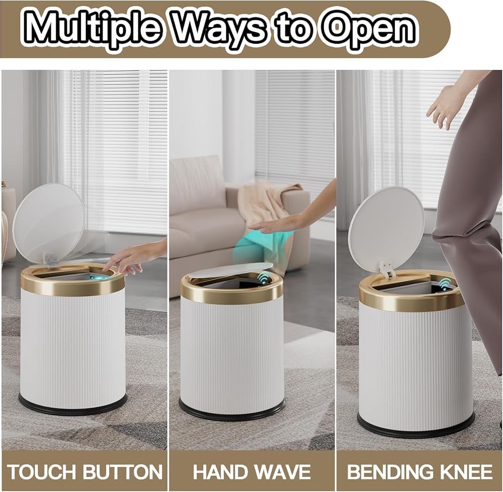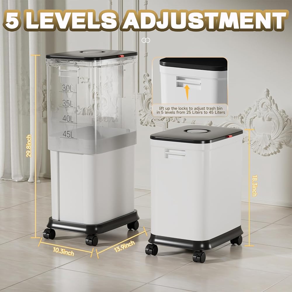 5 Levels Adjustments - by pressing the buttons on both sides of the trash can, you can adjust the height and capacity of the trash bin in 5 levels and choose the level that best suits your usage needs. Therefore, it can be used in any room such as kitchen, bathroom, living room, bedroom, study room, laundry, dining hall, etc(5 Levels: 20L, 30L, 35L, 40L, 45L)