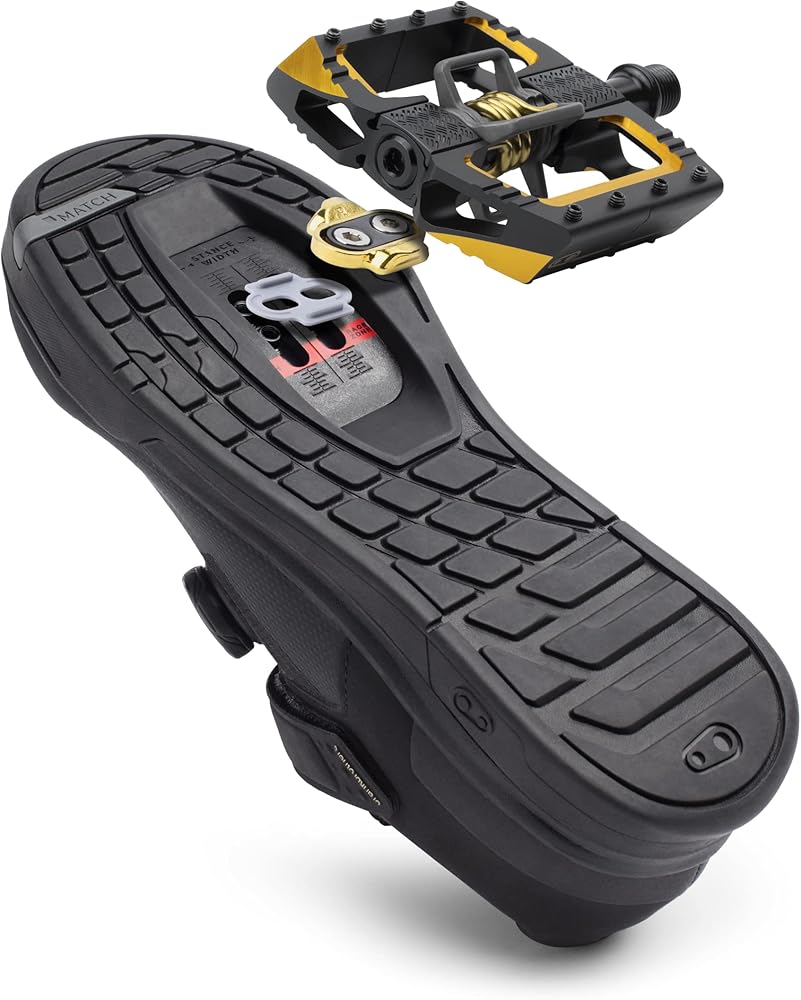 CLIP-IN SYSTEM DESIGNED FOR OPTIMAL SHOE / PEDAL INTERFACE: 4-sided entry for superior mud shedding, integrated traction pad technology to optimize the shoe/pedal interface, customizable float & release angle (premium brass cleats with shims included)