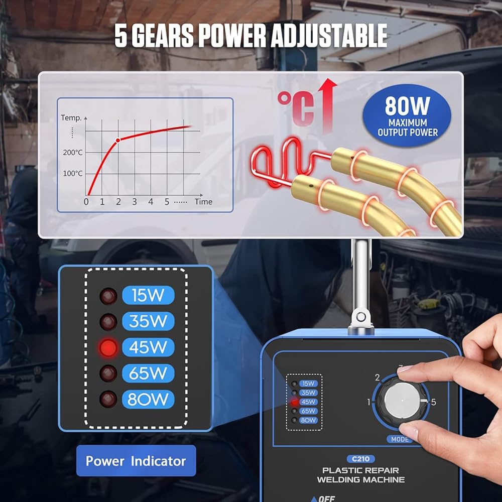 5 Gears Power Adjustable -- You can flexibly adjust the power between 15W, 35W, 45W, 60W and 80W according to different plastic materials, the maximum power is up to 80W, it can melt plastic in just seconds, effectively save your time. This machine adopts heat dissipation panel, which has good heat dissipation performance and allows long-time use.