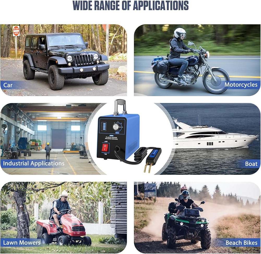 Wide Applications --This plastic welder kit can be used to repair plastic cracks in automobiles, motorcycles, ATVs, lawn mowers, boats and industrial applications. The equipped metal scraper and pliers can heat and smooth the plastic, weld, cut, double the strength and make it more beautiful.