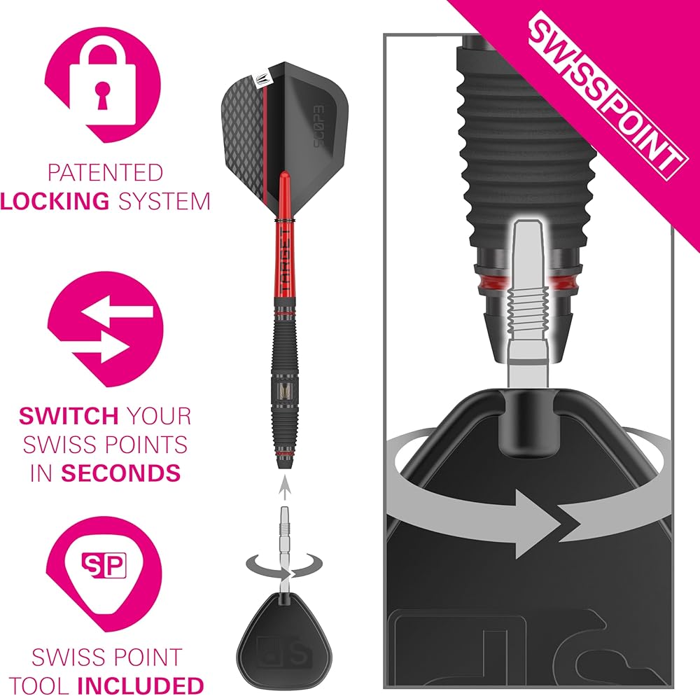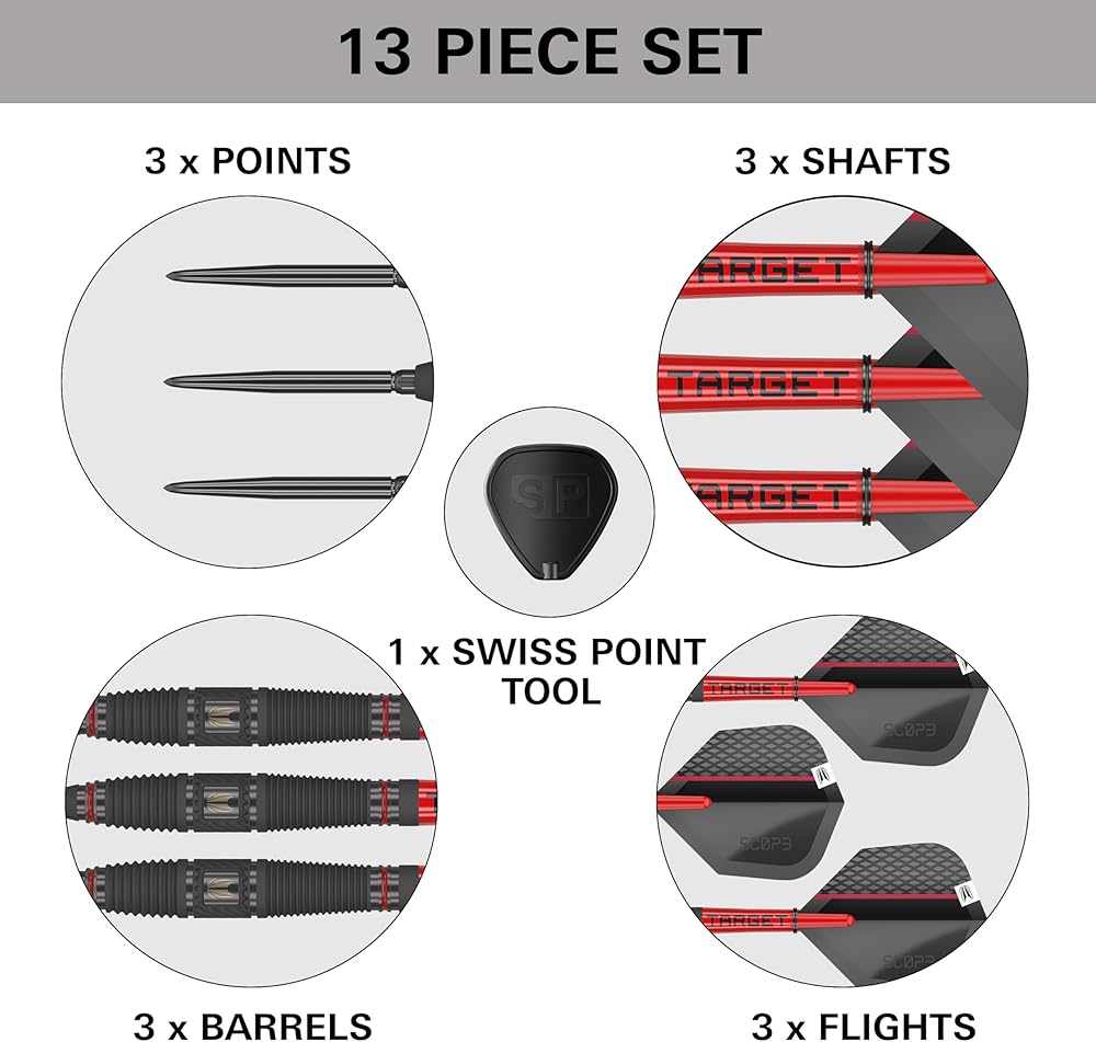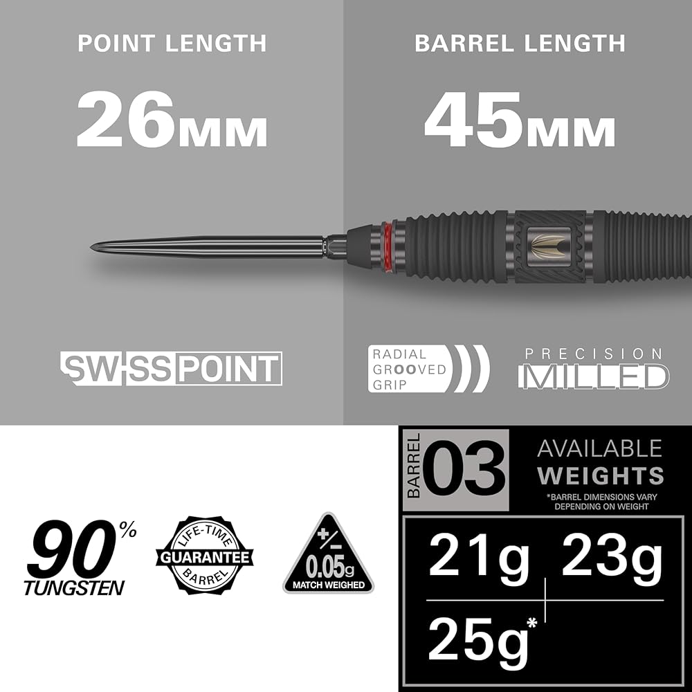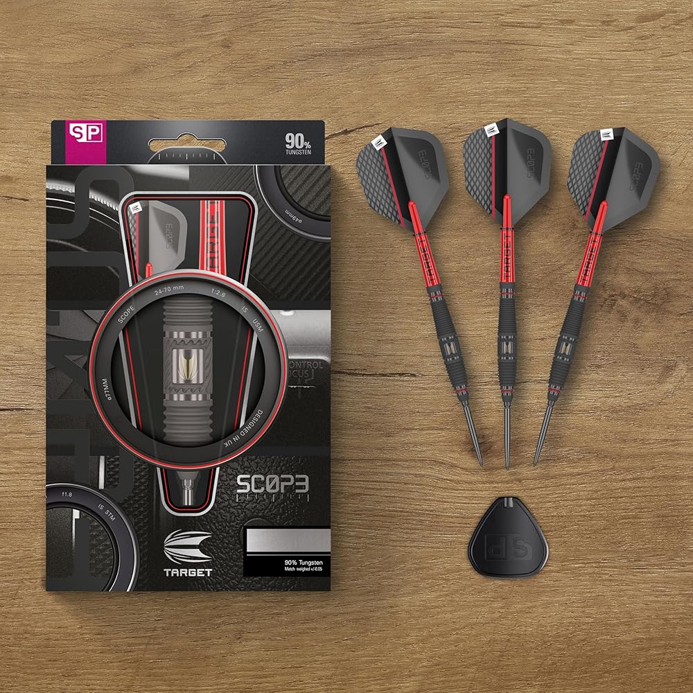 The Scope dart range is inspired by the intricate textures, features, and colours found in the finest photographic equipment. Each dart in this collection is crafted with a focus on detail, mirroring the qualities, elements, and the precision of high-end photography. The Scope 01 straight dart barrel is crafted from 90% tungsten, expertly milled with radial grooves at the front, and nano grooves towards the rear, enhancing the darts finger grip. The barrel is then sandblasted and treated with a sleek black PVD coating for enhanced durability and a refined matte finish, with flecks of red to add a pop of colour to the barrel. Target's 26mm smooth Swiss Points are included in the set, incorporating a patented locking mechanism, allowing for effortless switching of dart points. The taper and thread technology provide a secure and locked-in position, delivering stability and precision during every throw. Use the included Swiss Point Tool for effortless tip changes in seconds. The short Pro Grip Tag shafts (34mm) are made with a nylon compound, using a special moulding process. Incorporating a nib by the shaft petals and O-rings, facilitating easy flight insertion and grip strength. The precision moulded 2BA thread ensures that the shaft is compatible with all 2BA thread barrels. Completing the set with No.6 Pro Ultra Scope flights, featuring a spot UV print, which adds an additional layer of coating to the 100-micron material flight, improving shaft grip and adds an extra layer of protection against wear and tear to the printed design. The pack contains 3x 90% Tungsten Scope 01 dart barrels, 3x 26mm Black Swiss Points, 3x Short Pro Grip Tag Shafts (34mm), 3x Pro Ultra Scope No.6 Flights, and 1x Swiss Point Tool. Weights: 22G, 23G, 24G, 25G