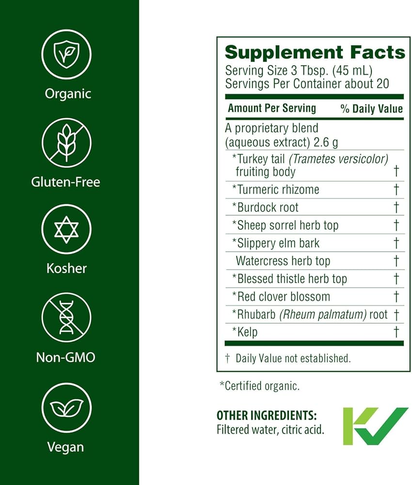 The health of your body is only as strong as the health of your cells. That's why for decades, people have relied on the renowned detox formula FlorEssence to gently cleanse the whole body at the cellular level.* Now, you can trust ImmuneEssence with Turkey Tail & Turmeric to not only detoxify, but build cellular immunity too.* This formula starts with the great-8 herbs found in our original FlorEssence formula: burdock root, sheep sorrel, slippery elm, watercress, blessed thistle, red clover blossom, rhubarb and kelp. It then adds immune-modulating turkey tail and antioxidant turmeric to fortify immunity, from the cells on up.* *Certified Organic