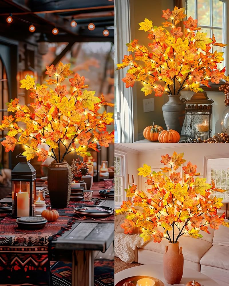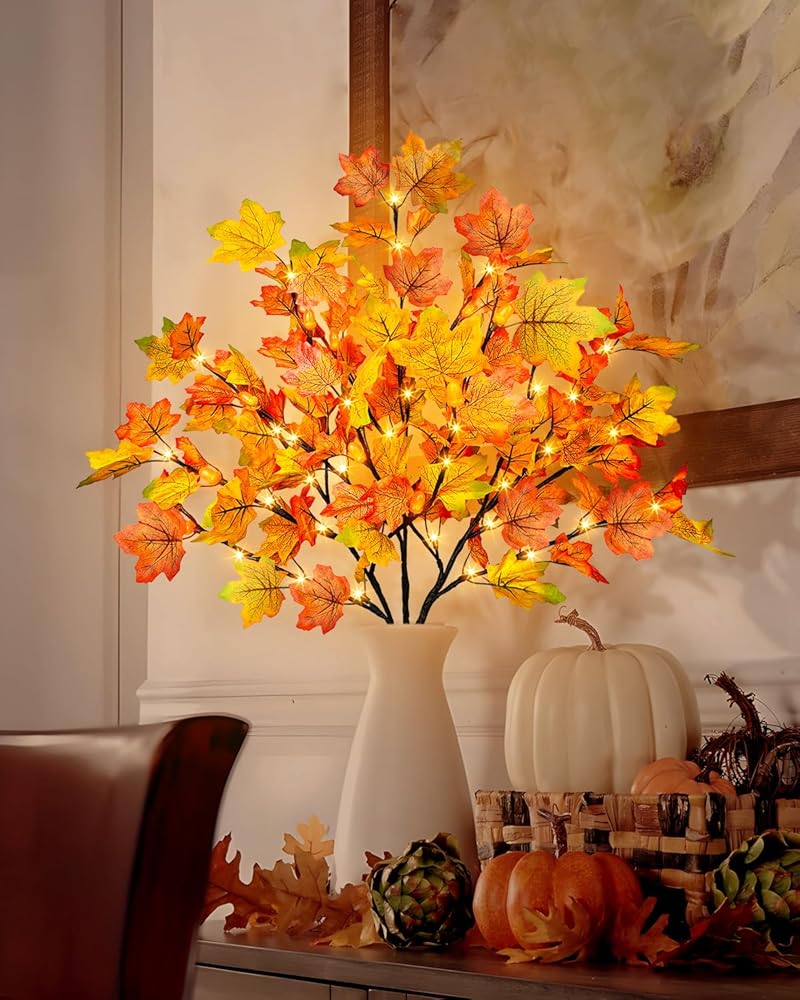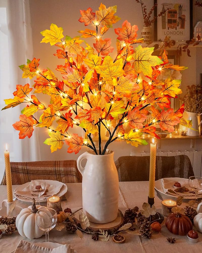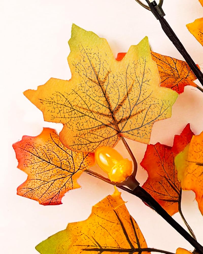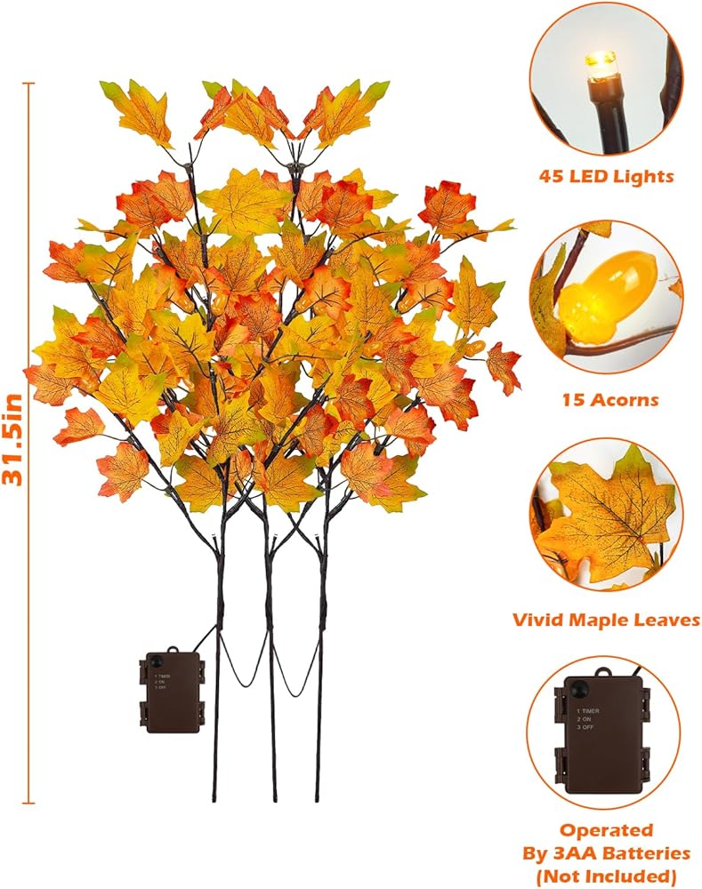 Fall Decoration Set: This set includes 3 pieces of lighted fall maple leaves branches with 60 LED, 15 acorns, each measures about 31.4" in length, each stem has 5 bendable branches, the color of the maple leaves range from vibrant orange to red, combined with the realistic acorns, adding warmth and a festive atmosphere to your home