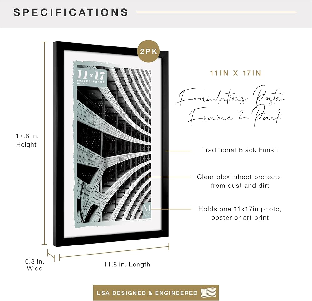 The MCS Gallery Foundation Poster Frame is the ideal choice for displaying your favorite posters, prints, or artwork. These 11x17 picture frames have a sleek, contemporary design that complements most decor styles. These gallery wall frames feature a black finish that helps create an upscale, trend-forward display. Our multipurpose hanging picture frames, poster frames, photo frames, and puzzle frames come with 2 pre-attached sawtooth hangers for vertical or horizontal mounting. These large picture frames feature plexi fronts, a safe and durable alternative to glass. MCS Gallery Foundation Poster Frames make the perfect addition to your home, office, or dorm room. Thanks to their contemporary design, you can create stunning gallery walls and more. Mix and match sizes and finishes to create a look that is all your own!