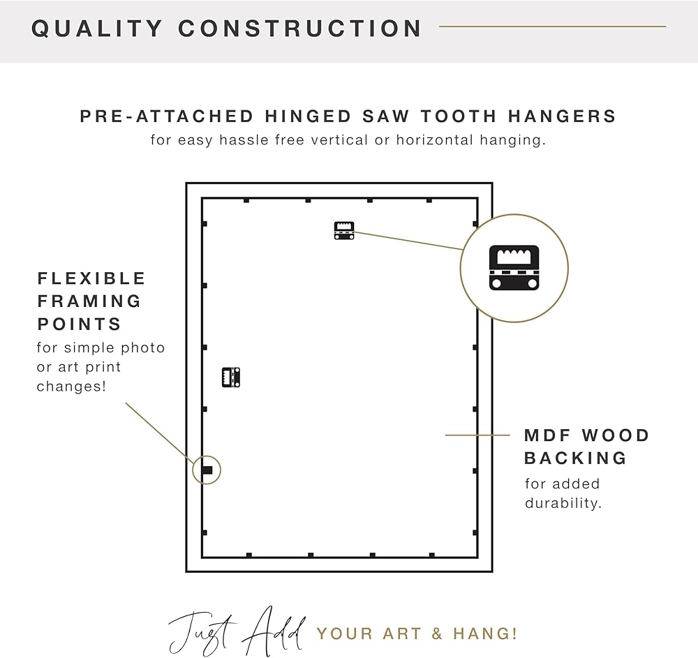 Easy To Use: Our modern hanging picture frames have MDF wood backs that make adding your photo or art print a breeze; Frames include 2 pre-attached sawtooth hangers for easy vertical or horizontal hanging