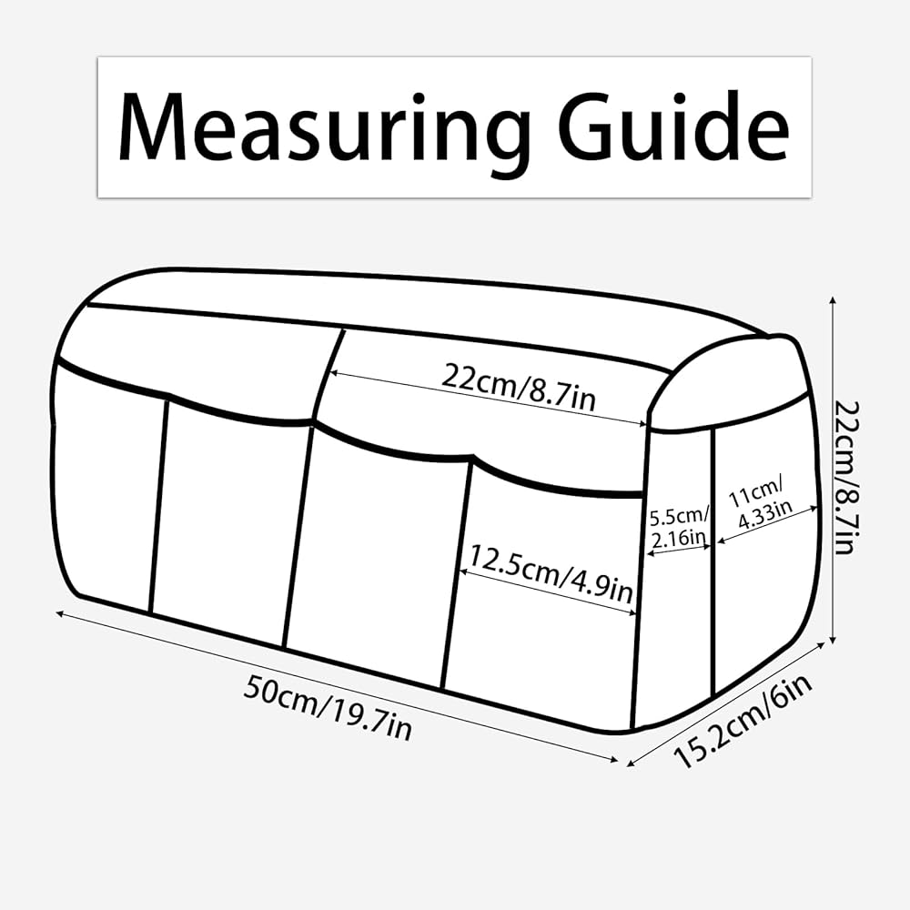 Universal Size: 19.7 x 6 x 8.7 inch/50 x 15.2 x 22 cm. (L x W x H). fit most sofas (EXCEPT leather couch), recliners and chair armrests, avoid the armrests from being worn or damaged. Sofa caddy has no the differences between right and left, which can be covered your left or right arm chair according to your conveniences