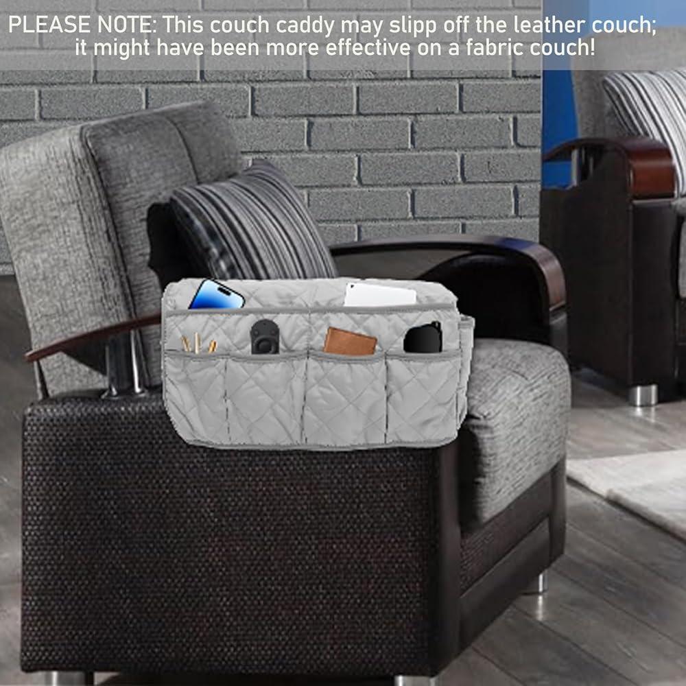Please Note: The armchair caddy may slipp off the leather couch; it might have been more effective on a fabric couch! Machine washable in cold water. Wash separately at gentle cycle. Using mild laundry detergent. Do not bleac