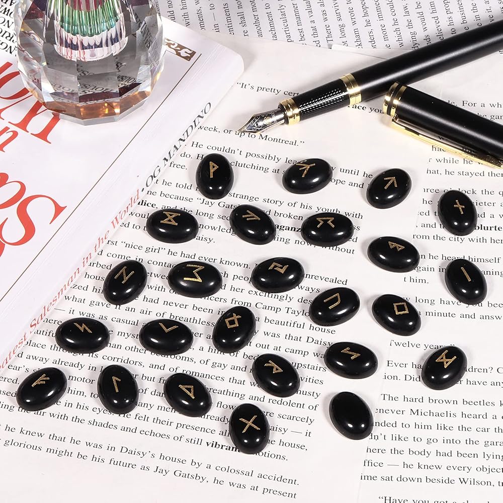 mookaitedecor Black Obsidian Crystal Rune Stones Set of 25, Flatback Cabochon Stone Engraved Elder Futhark Alphabet Symbol Wiccan Crystals for Divination and Healing