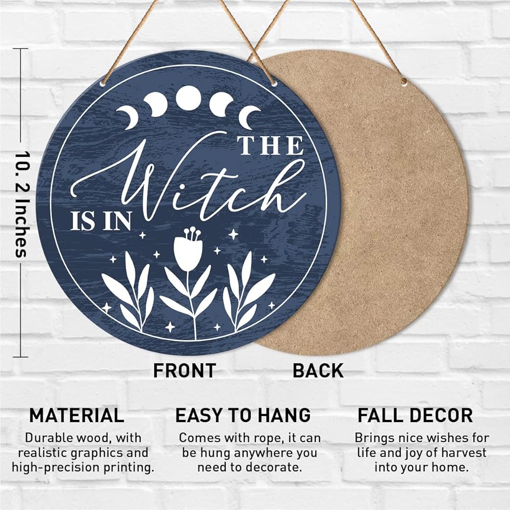 Muktoujaumai Witch Sign Front Door Decor, Halloween Witch Round Hanging Sign Decor Wiccan Wall Wooden Decorations Witchy Wood Sign for Porch, Gothic Home, The Witch Is in