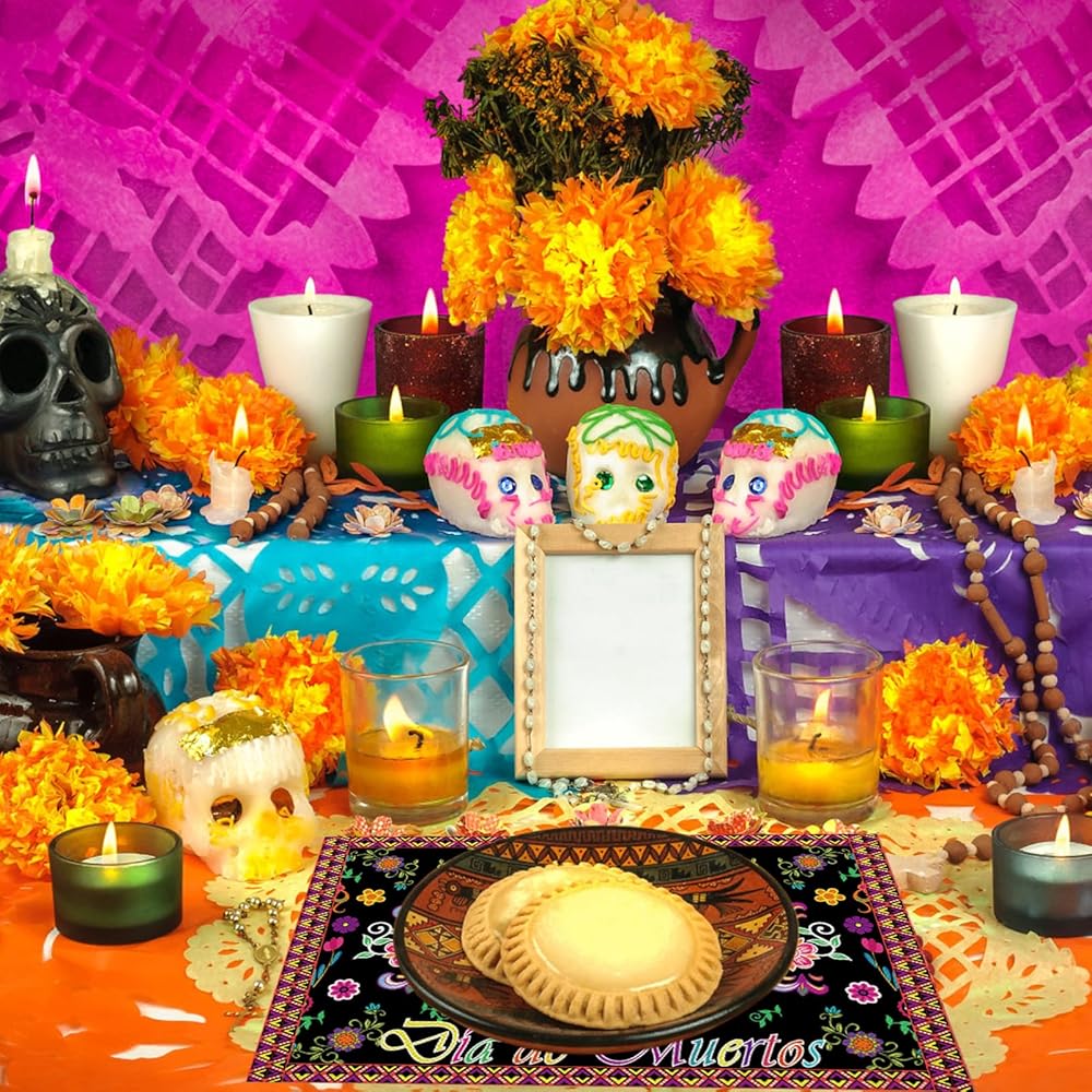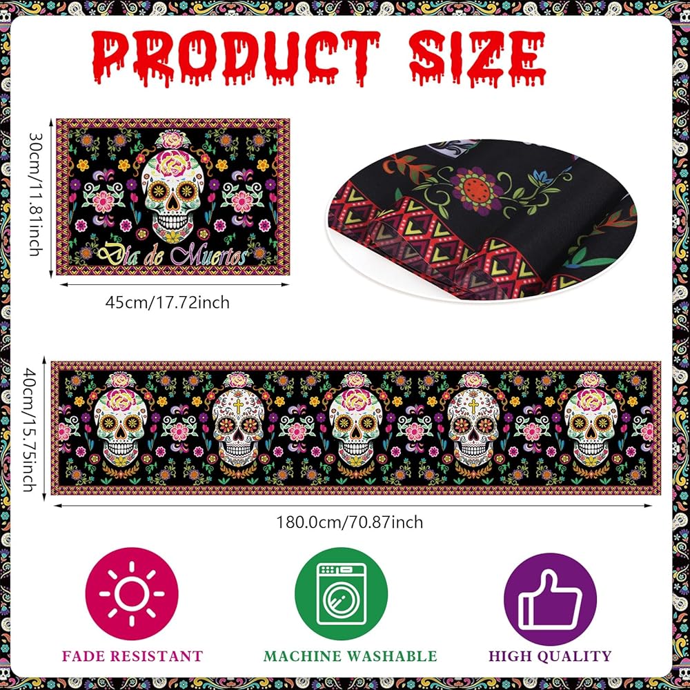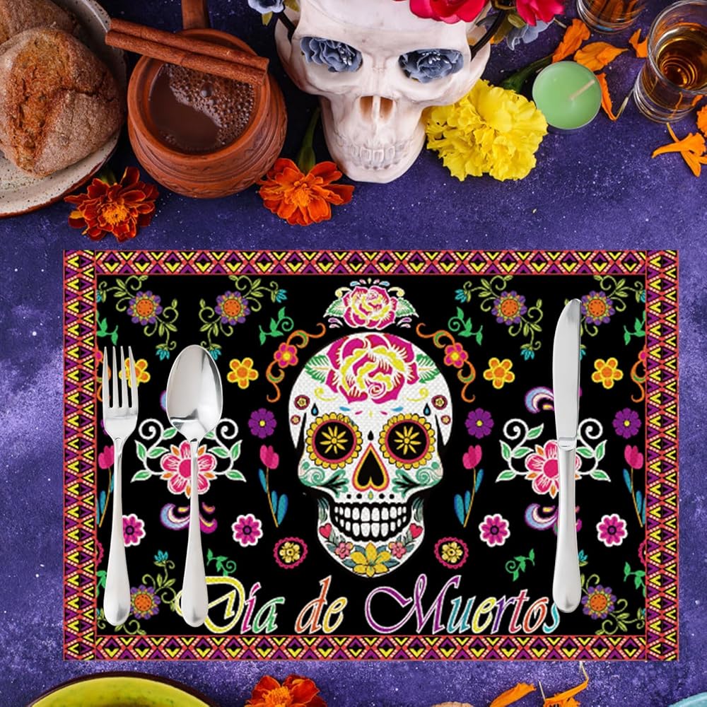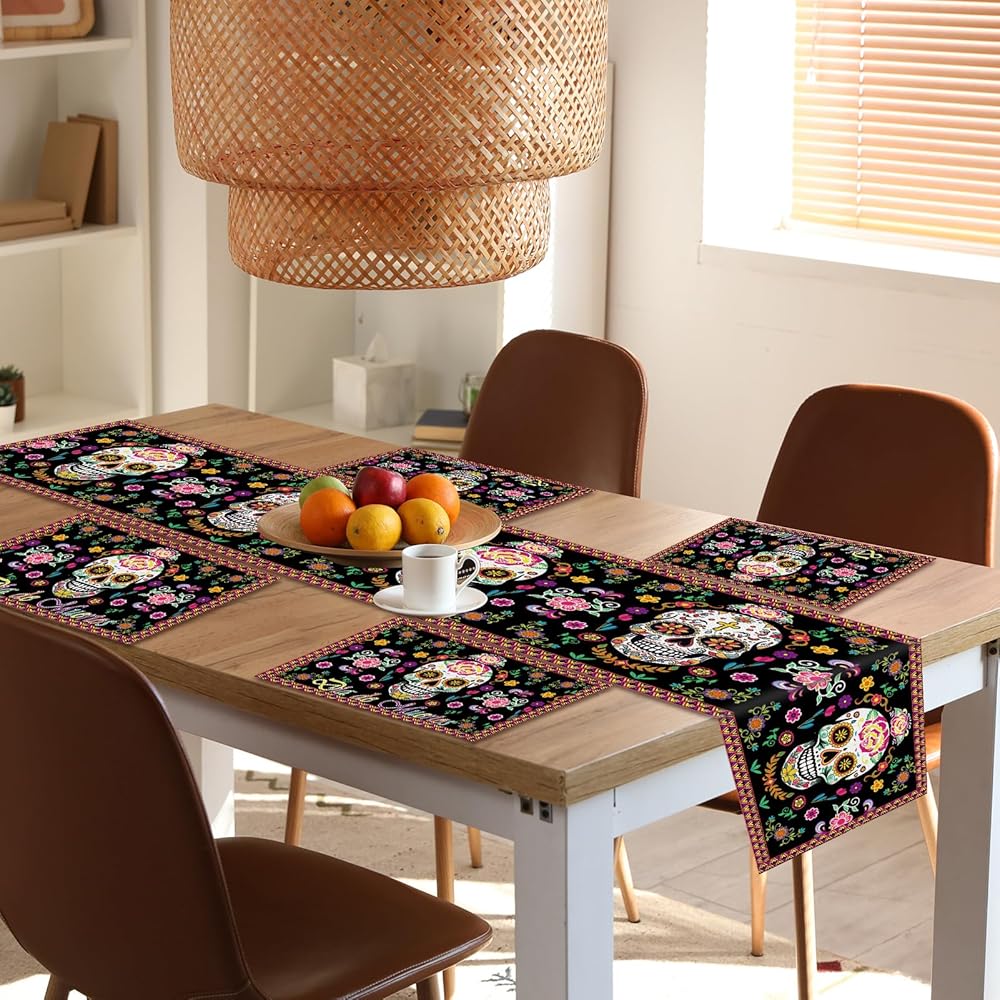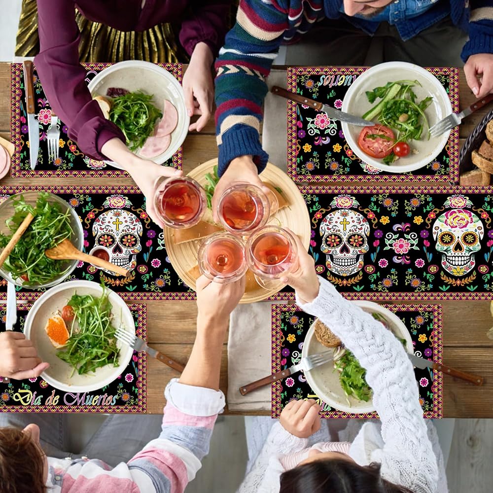 Enhance your Day of the Dead celebrations with our Day of the Dead Table Runner and Place Mat set. Featuring intricate sugar skull designs, this set of 5 table liners and placemats adds a vibrant and festive touch to your Mexico Day of the Dead kitchen and dining decor. Perfect for creating an authentic and colorful atmosphere for your Day of the Dead party.