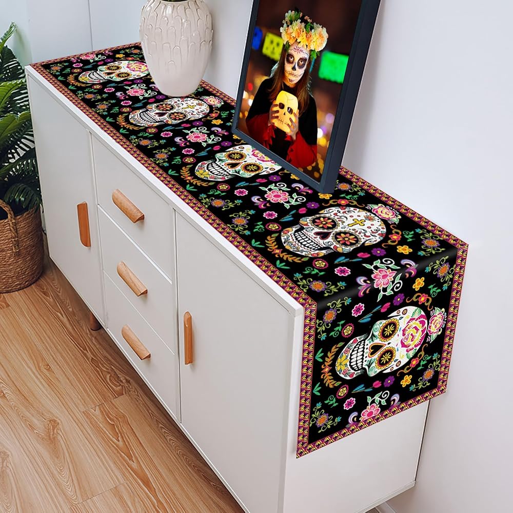 Dia De Los Muertos Sugar Skull Table Runner measures 16" x 71" (40 x 180 cm)