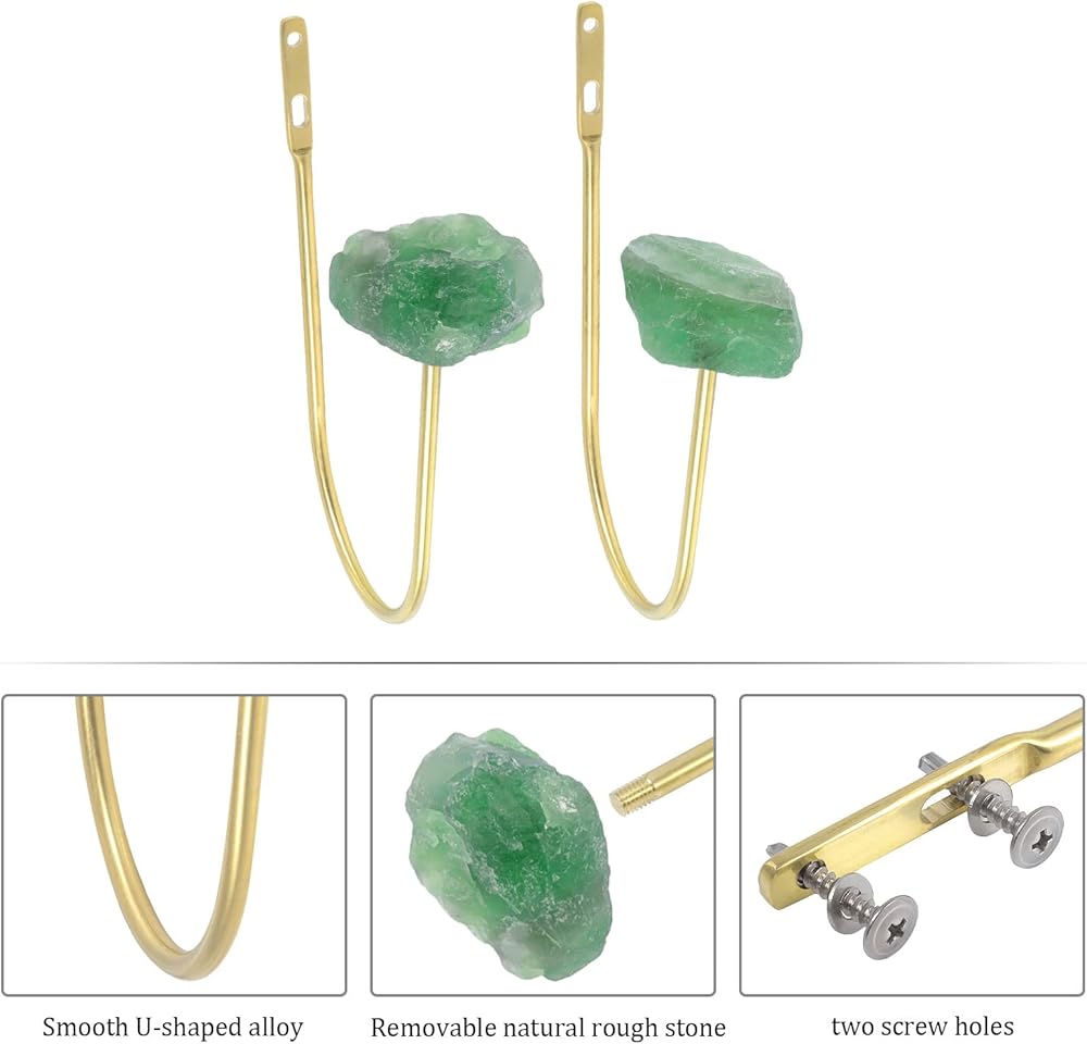 U-Shaped Curtain Tieback Hooks with Rough Crystal Stone: Crystal curtain hooks are made of crystal stone, alloy, stainless steel and plastic. The U-shaped hook with stone has a fashionable and novel design and is sturdy and durable. Each rough crystal stone is unique.